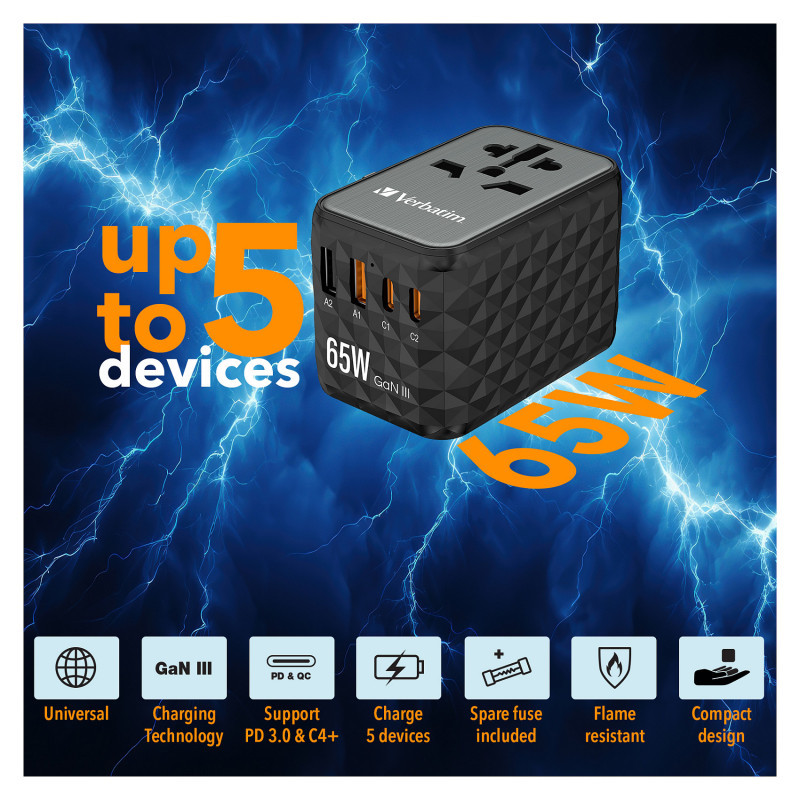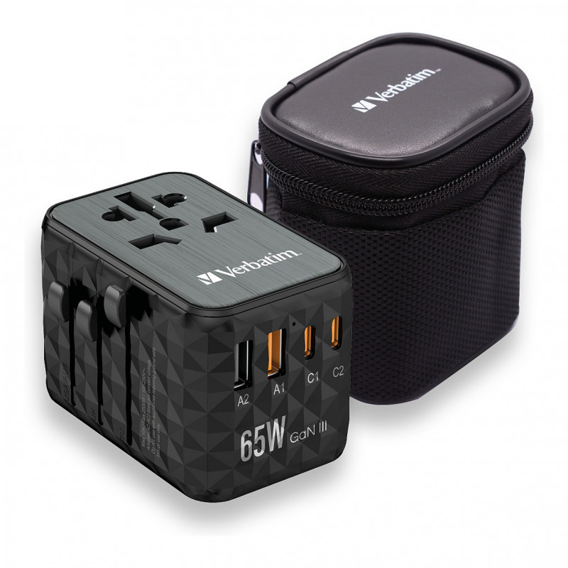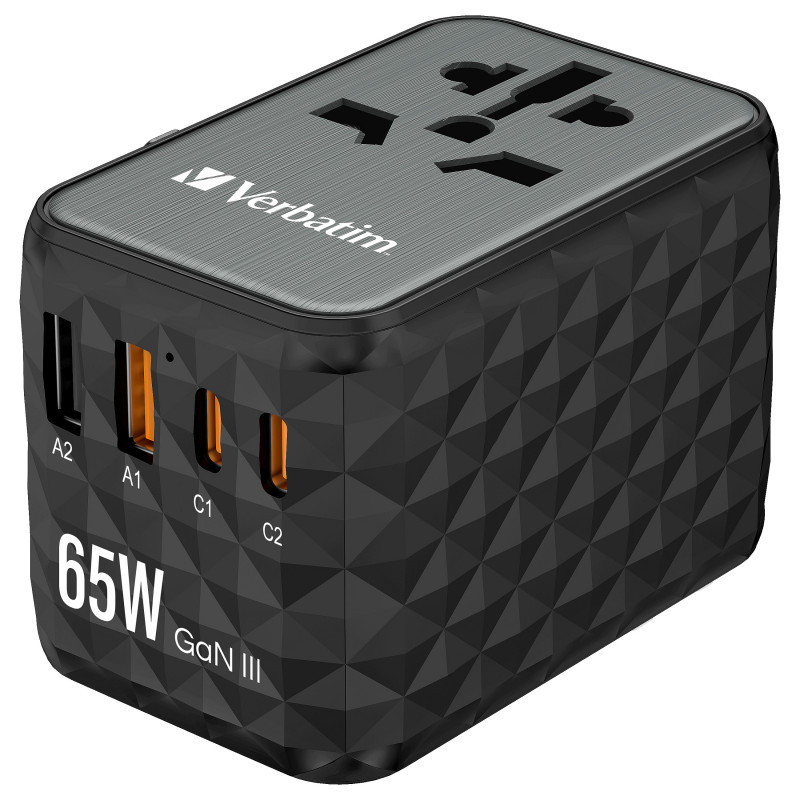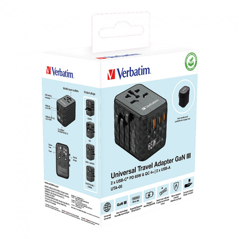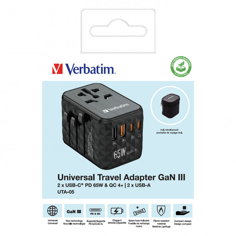 "Verbatim UTA-05 65W GaN III Universal Travel Adapter with 2 x USB-C PD & QC 4+ & 2 x USB-A ports. Charger type: Indoor, Power source type: AC, Charger compatibility: Universal. Product colour: Black"\n"Worldwide Travel Adapter