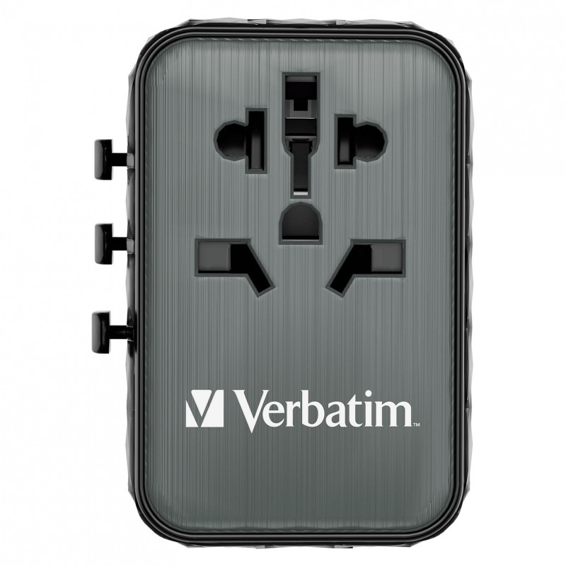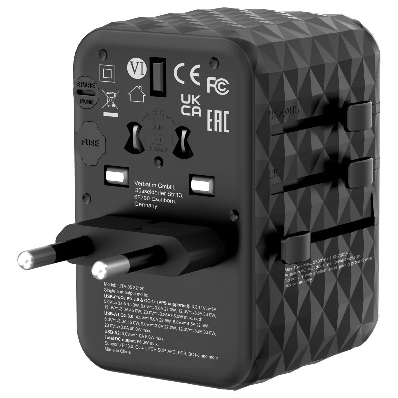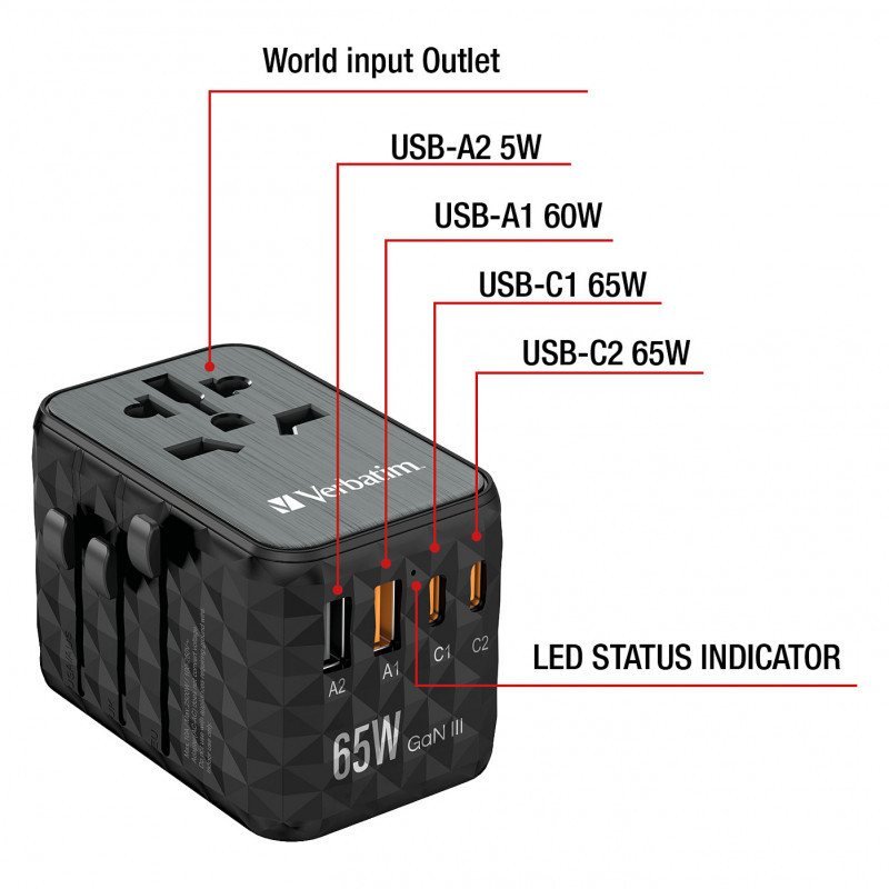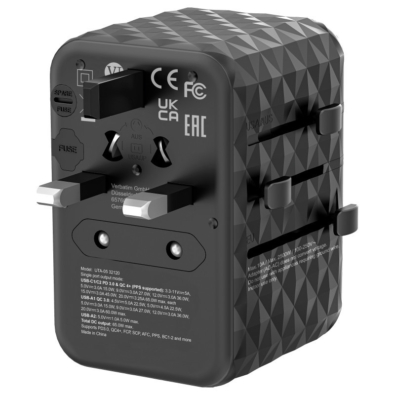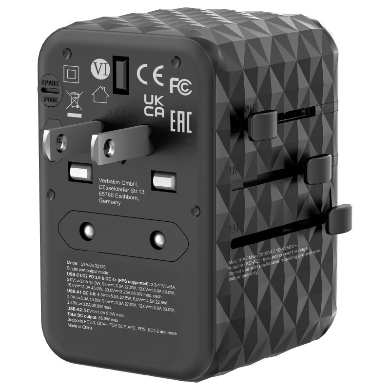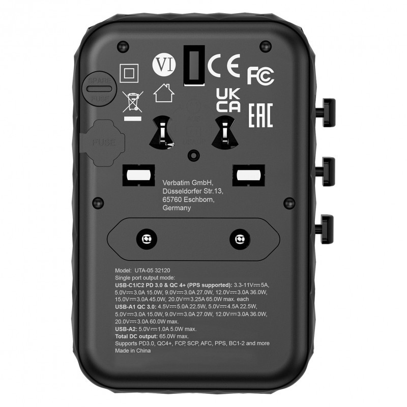 "Verbatim UTA-05 65W GaN III Universal Travel Adapter with 2 x USB-C PD & QC 4+ & 2 x USB-A ports. Charger type: Indoor, Power source type: AC, Charger compatibility: Universal. Product colour: Black"\n"Worldwide Travel Adapter