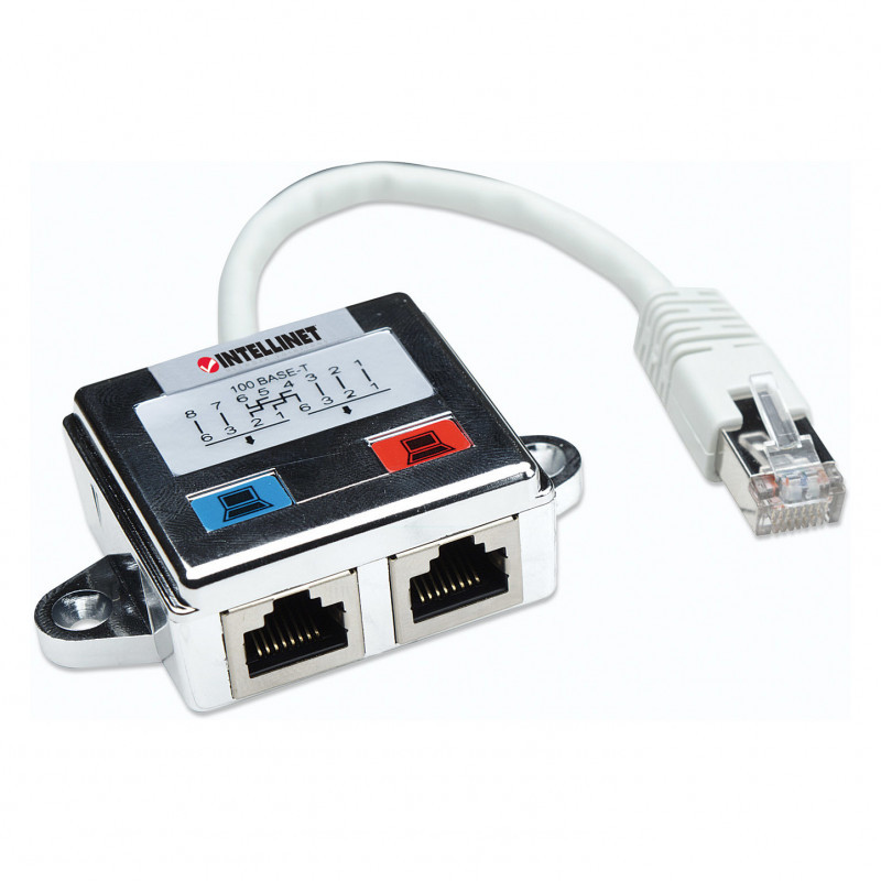 "Intellinet 2-Port Modular Distributor, Cat5e, FTP, allows two RJ45 ports to share one Cat5e network cable. Connector 1: 2 x RJ45, Connector 2: RJ45. Product colour: Silver, White"\n"- Allows two RJ45 ports to share one Cat5 shielded network cable