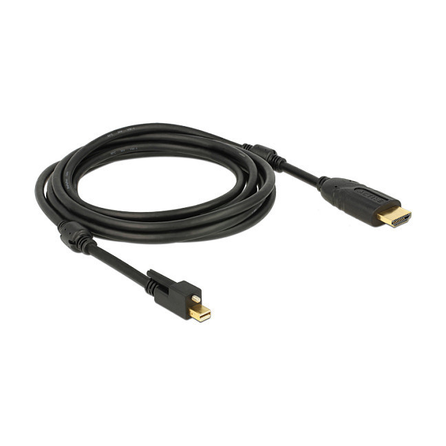 "DeLOCK 83731. Cable length: 3 m, Connector 1: Mini DisplayPort, Connector 2: HDMI. Cable diameter: 5.5 mm. Package type: Polybag"\n"This cable enables you to connect a HDMI monitor through a free mini Displayport interface. The cable supports a resolution up to Ultra HD (4K) and is backward compatible to Full-HD 1080p. The screw of the mini Displayport connector secures the connection and prevents accidental unplugging of the cable."
