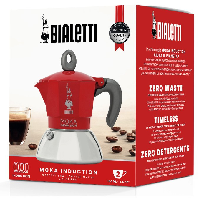 "Bialetti Moka induction. Product type: Moka pot, Capacity: 0.1 L, Product colour: Red, Silver. Quantity per pack: 1 pc(s)"\n"Induction mocha teapot Bialetti Moka Induction for 2 cups of coffee. The upper part is made of food grade aluminum with a red surface, the lower part is made of polished 18/10 stainless steel and with a black plastic heat-resistant handle."
