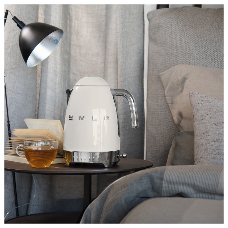"Smeg 50's Style Kettles KLF04CREU Cream. Water tank capacity: 1.7 L. Power: 2400 W. Product colour: Cream, Housing material: Plastic, Stainless steel, Adjustable thermostat, Water level indicator, Overheat protection. Cordless. Keep warm function, Filtering"\n"Smeg's iconic retro design offers a pop of colour and a premium enamelled finish. The KLF04 variable temperature kettle allows you to choose from 7 set temperatures ranging from 50°C to 100°C. With a generous capacity of 1.7 litres, you can make up to 7 cups of your favourite tea whether it be breakfast, green, or fruit. The keep warm button allows you to keep the water at your selected temperature for up to 20 minutes, ensuring the perfect beverage is always to hand.