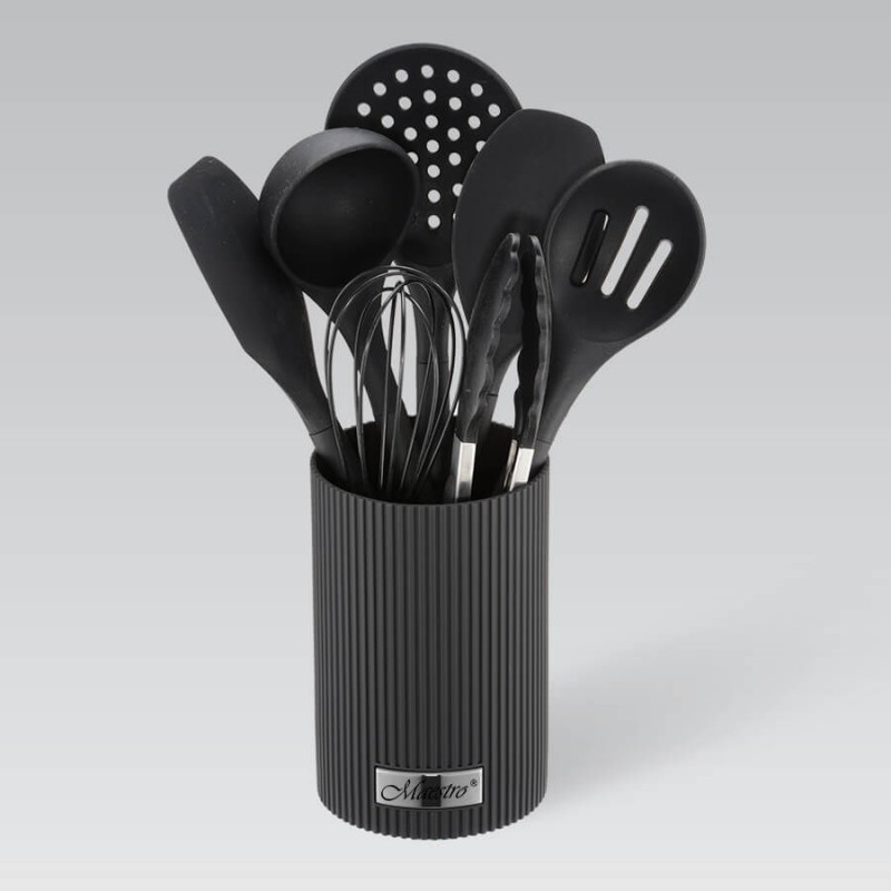 MAESTRO MR-1542-BLACK – tai 8 dalių virtuvės įrankių rinkinys juodos spalvos, skirtas visiems kasdieniams maisto gaminimo darbams. Komplektą sudaro būtiniausi virtuviniai įrankiai — šaukštas, sietuvė (skyletė), samtelis sriubai, mentele, žnyplės, plaktuvas ir stovas — tad su juo lengvai sutvarkysite tiek kasdienes ruošos užduotis, tiek intensyvesnį maisto gaminimą. Įrankiai pagaminti iš silikono ir papildomų patvarių medžiagų, todėl yra atsparūs karščiui, patogūs naudoti ir saugūs indams — net tinka nepridegančioms keptuvėms. Ergonomiškos rankenos ir galimybė pakabinti įrankius leidžia sutvarkyti virtuvę greitai, o įrankių stovas padeda juos laikyti tvarkingai.