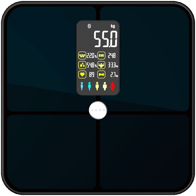 Low Battery Indication Operate via user-friendly AENO app Perfect weight сontrol assistant: weight change chart Automated metabolism analysis (BMI) High load capacity - up to 180kg High-precise sensors: 100 g step Multi-user friendly: 10 user profiles + 1 guest Easy to clean: tempered ITO glass 3 unit conversion: kg, lb, st Wide possibilities in the app Minimal weight 5kg Fast connection Auto Power On Auto Power Off (after 15 sec) Basal metabolism rate with precise analyses of needed kCal Measurement step - 50g Advanced body composition analyzer: 16 metrics Automated heart health assessment Large informative color screen Parameters, no need to turn on app to see them 4 active electrodes for detailed analyses of your body Tempered glass surface - easy to clean 16 various measurements: Heart Rate, Weight, BMI, Body Fat Rate, Muscle Mass, Body Fat Index, Fat Mass, Obesity Level, Ideal weight, Weight Control, Visceral Fat Index, Weight without Fat, Body Water, Bone Mass, Protein Rate, BMR, Metabolic Age LED display |