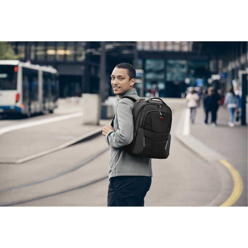 "Wenger/SwissGear Altair. Backpack type: Casual backpack, Product main colour: Black, Style: City. Width: 320 mm, Depth: 210 mm, Height: 440 mm. Material: Polyester, Polyvinyl chloride (PVC), Recycled polyester, Material details: 79% Recycled Polyester, 17% Polyester, 4% PVC, Total amount of recycled materials used for making: 79%"\n"15.6'' Laptop Backpack with Tablet Pocket