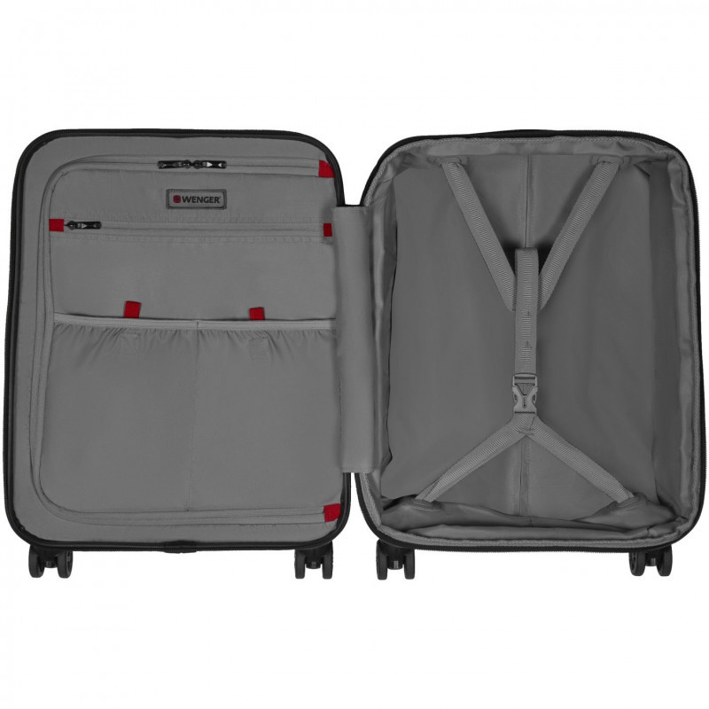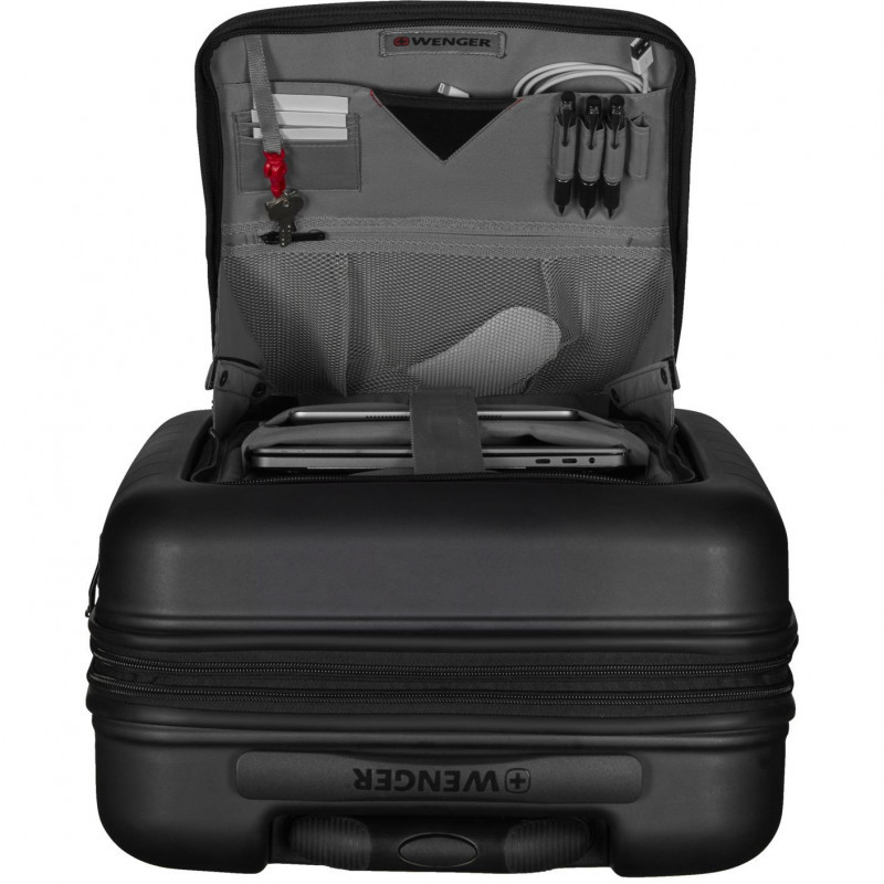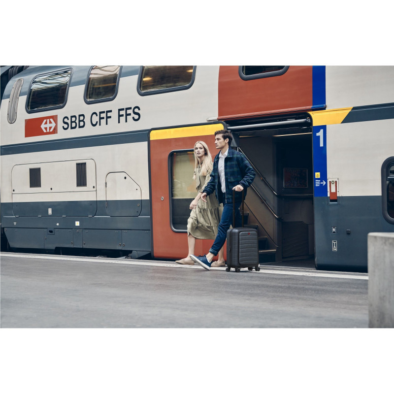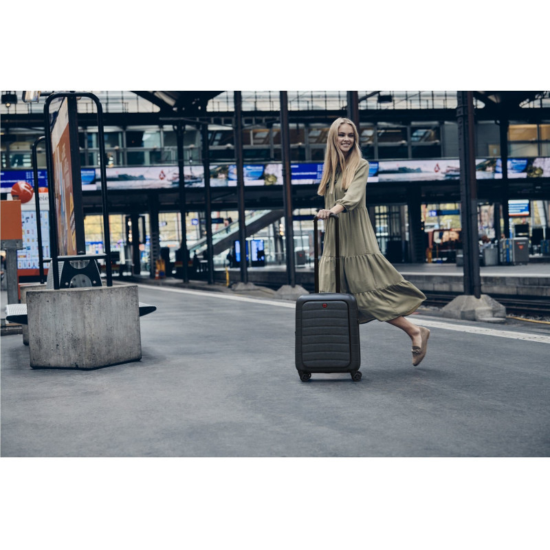 "Wenger/SwissGear Syntry. Luggage type: Trolley, Product main colour: Black, Grey, Number of wheels: 4 wheel(s). Volume: 36 L, Expanded volume: 44 L, Height: 550 mm. Material: Polycarbonate, Polyester"\n"Robust yet perfectly portable, the Syntry Carry-On is a powerhouse rolling case with precision maneuverability. The compression molded front compartment safely stores your 14'' laptop and 10'' tablet, while the quick pocket offers speedy access to important items. Spacious and secure thanks to the combination lock and security zipper, there's also a USB charger and integral ID tray. Four super quiet dual-caster wheels make for easy wheeling, so you can sail across the terminal or cruise along the platform.
