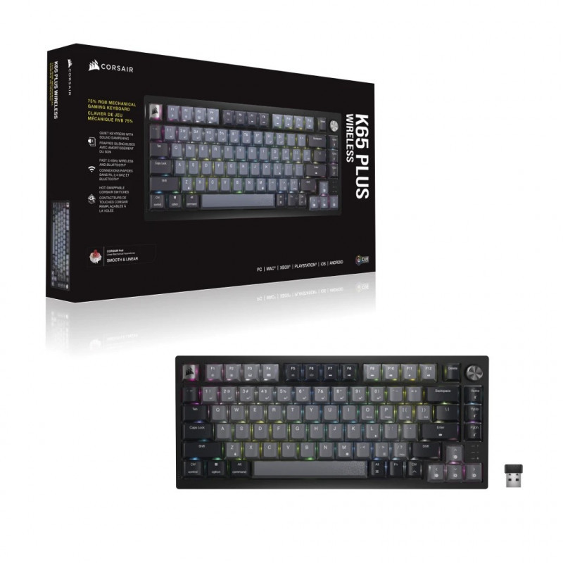 Corsair K65 PLUS WIRELESS 75 % RGB klaviatūra Žaidimams RF belaidis + USB QWERTY Anglų Juoda