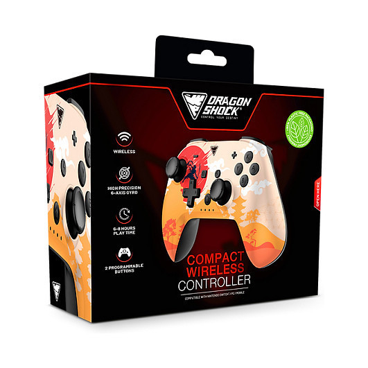 "Dragonshock PopTop Compact. Device type: Gamepad, Gaming platforms supported: Nintendo Switch, Gaming control function buttons: Back button, D-pad, Home button, Reset button. Connectivity technology: Wireless, Device interface: Bluetooth, USB connector type: USB Type-C. Product colour: Multicolour, Cable length: 1 m. Power source: Battery, Battery type: Built-in, Battery technology: Lithium-Ion (Li-Ion). Width: 165 mm, Depth: 134 mm, Height: 70 mm"\n