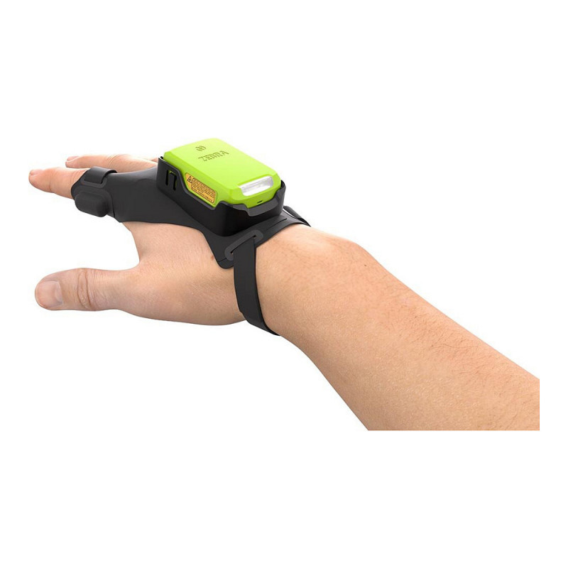 "Zebra RS2100. Type: Wearable bar code reader, Scanner type: 2D, Sensor type: Laser. Connectivity technology: Wireless, Standard interfaces: Bluetooth. Product colour: Green. Power source type: Battery, Battery technology: Lithium-Ion (Li-Ion), Battery type: Built-in battery. Weight: 31 g, Width: 35.5 mm, Depth: 52 mm"\n"Hands-free mobility can give your workflows an instant productivity boost, but you need a solution that your workers want to wear — and fits your budget. Introducing the RS2100 Wearable Scanner — the smallest enterprise wearable scanner on the market. An innovative back of hand design offers new levels of worker comfort and dexterity. The unique mount leaves the palm completely unobstructed, providing complete freedom to handle items. The very low profile enables easy picking in tight spaces. There’s nothing complicated about this wearable scanner: it’s simple to purchase, deploy, wear and manage. An optional Device Tracker license makes it easy to find a missing RS2100 scanner. Get the edge you need to compete in today’s economy with the RS2100 Wearable Scanner — a new level of wearable comfort, productivity and simplicity.