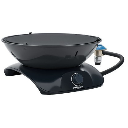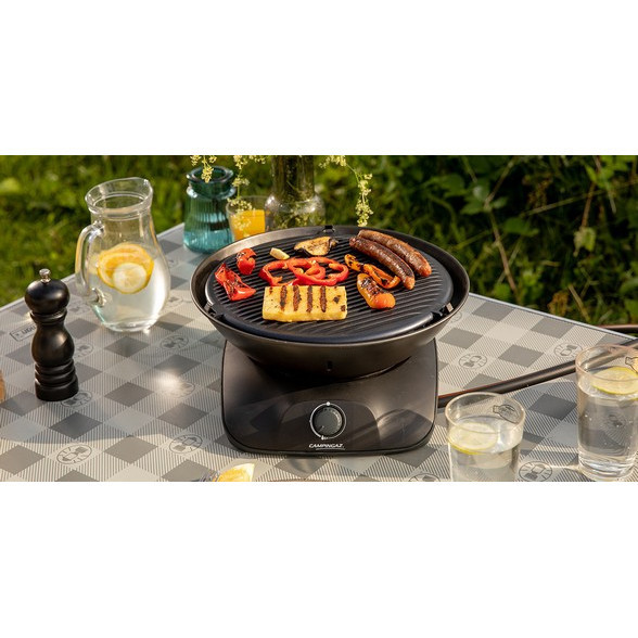 "Campingaz 360 Grill CV. Total power: 2400 W, Type: Grill, Best uses: Indoor. Form factor: Tabletop, Top surface type: Griddle, Product colour: Black. Control type: Buttons, Rotary. Width: 350 mm, Depth: 350 mm, Height: 160 mm"\n"Introducing the very first table-top style gas grill with a flat design that can be grilled on from 360° while comfortably sitting at the table. The Campingaz® 360 Grill offers extensive grilling and cooking versatility with an included ribbed griddle, flat plancha as well as a pan support for stove cooking.