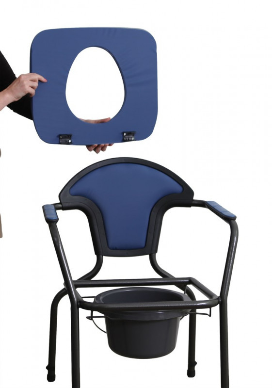 Tvirtas, stabilus rėmas ir ergonomiška sėdimoji dalis užtikrina patogų naudojimą, o tamsiai mėlyna spalva suteikia modernumo ir jaukumo pojūtį. Kėdė turi integruotą sanitarinį indą, kurį galima lengvai išimti ir valyti.