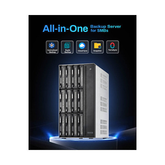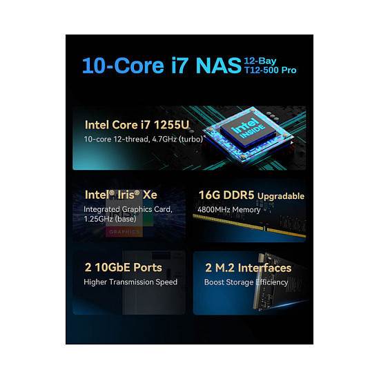 "TerraMaster T12-500 Pro. Type: NAS. Chassis type: Mini Tower. Device class: Home & Home Office. Processor family: Intel® Core™ i7. Internal memory: 16 GB, Internal memory type: DDR5. Total installed storage capacity: 0 TB"\n"High-Performance Backup Server: The T12-500 Pro NAS storage is powered by Core i7-1255U processor with 10 cores, 12 threads, and turbo speeds up to 4.7GHz. It features Iris Xe Graphics with a 1.25GHz dynamic frequency and supports AES NI hardware encryption. Equipped with 16GB DDR5 memory and dual 10 Gigabit Ethernet ports, it delivers strong performance. Its two M.2 NVMe slots enhance storage efficiency with Hyper Cache. This makes the T12-500 Pro a top choice for high-performance backup solutions for small to medium-sized businesses.
