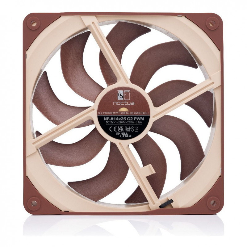 "Noctua NF-A14X25 G2 PWM. Type: Fan, Fan diameter: 14 cm, Rotational speed (max): 1500 RPM, Airflow: 155.6 m³/h, Bearing type: Self-Stabilising Oil-pressure Bearing (SSO). Voltage: 12 V. Width: 140 mm, Depth: 25 mm, Height: 140 mm. Product colour: Beige"\n"Succeeding the award-winning NF-A14 and building on the technological innovations of the ground-breaking NF-A12x25, the NF-A14x25 G2 is Noctua’s next-generation square-frame 140mm flagship model: Made from Sterrox® LCP, its highly optimised Progressive-Bend impeller with winglets, Flow Acceleration Channels and Centrifugal Turbulator hub combined with a tip-clearance of only 0.7mm allow the NF-A14x25 G2 to further improve its predecessor’s renowned quiet cooling performance. Like the NF-A14 and NF-A12x25, it is a true all-rounder that yields superb results in all types of usage, regardless of whether it’s in low-impedance, airflow-oriented applications such as case cooling, or high-impedance, static pressure demanding scenarios such as on heatsinks and water cooling radiators. For application-specific optimisation, the NF-A14x25 G2 comes with an NA-AVG2-LR anti-vibration gasket pre-installed to create a tighter seal on radiators. Additionally, its AAO (Advanced Acoustic Optimisation) frame can be combined with the optional NA-IS1-14 inlet spacer, which can help to achieve superior suction acoustics and flow rates in challenging intake configurations. The 4-pin PWM version supports fully automatic speed control via PWM fan headers and comes with a Low-Noise Adaptor to reduce the maximum speed from 1500 to 1250rpm. Its ultra-low-loss etaPERF™ motor with Smooth Commutation Drive 2 technology doesn’t only provide unprecedented energy efficiency and running smoothness, but thanks to the new SupraTorque™ feature, it can also leverage extra torque headroom to keep the fan at its desired speed when working against back pressure, thereby ensuring even better performance on heatsinks and radiators. Topped off with Noctua’s reference-class SSO2 bearing, a rich bundle of accessories and 6-year manufacturer’s warranty, the NF-A14x25 G2 is a premium-quality product through and through. Its superior performance, comprehensive feature set, cutting-edge construction and state-of-the-art materials set a new standard within Noctua’s portfolio and make it an elite choice for the most discerning demands."