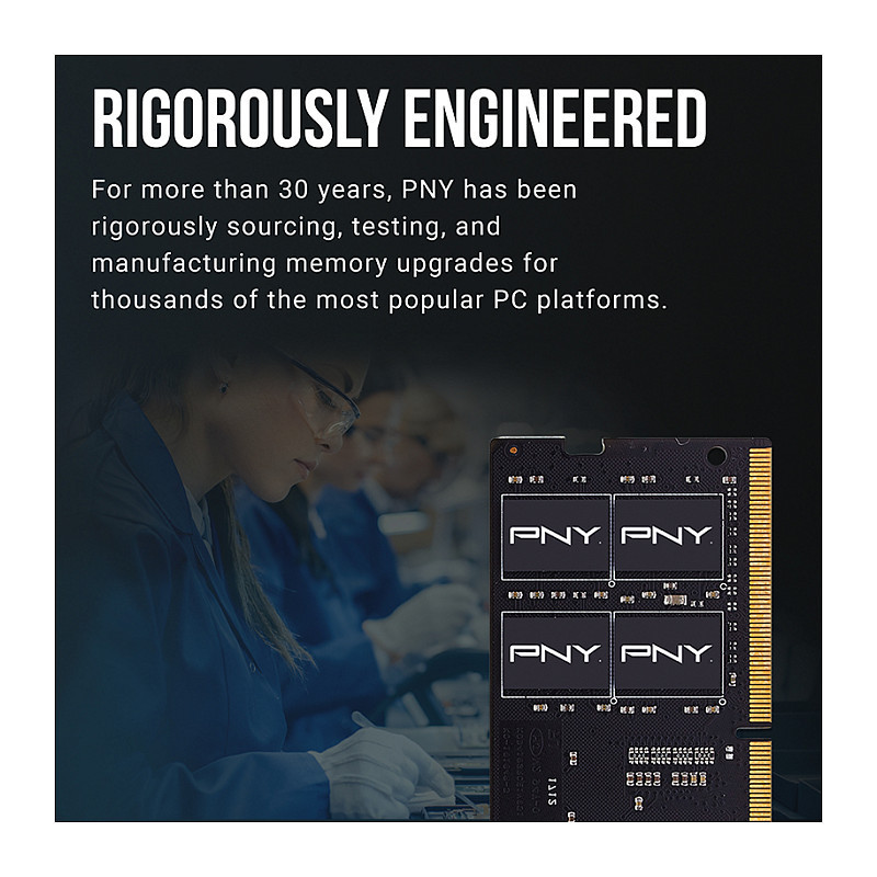 "PNY Performance. Component for: Laptop, Internal memory: 16 GB, Memory layout (modules x size): 1 x 16 GB, Internal memory type: DDR4, Memory clock speed: 3200 MHz, Memory form factor: 260-pin SO-DIMM, CAS latency: 22"\n"GET BETTER PC PERFORMANCE WITH A PNY DDR4 PC MEMORY UPGRADE