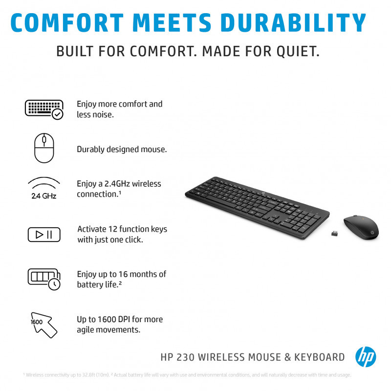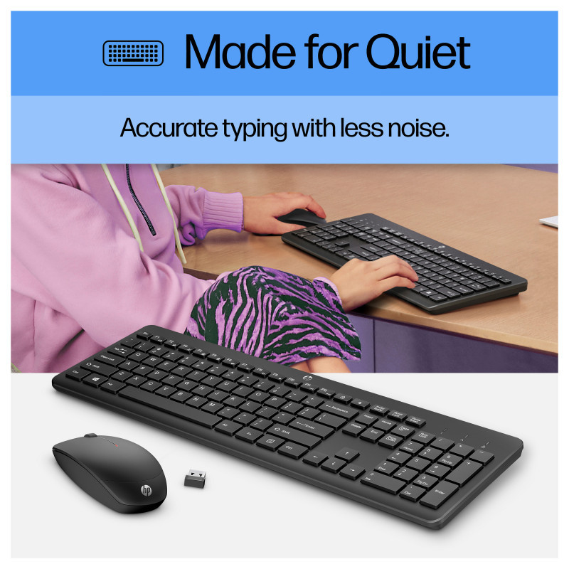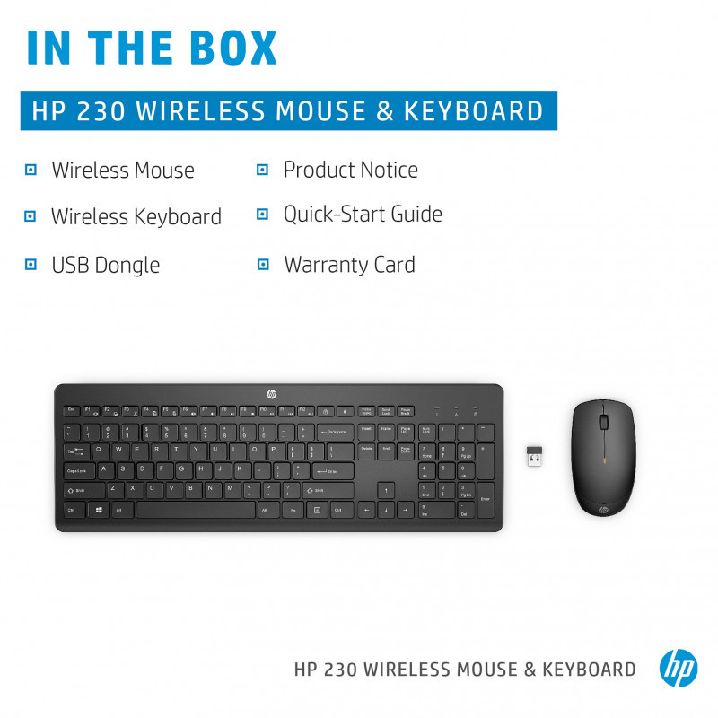 "HP 230 Wireless Mouse and Keyboard Combo. Keyboard form factor: Full-size (100%), Connectivity technology: Wireless, Device interface: RF Wireless, Keyboard key switch: Membrane, Recommended usage: Office. Product colour: Black. Mouse included"\n"Built for comfort, made for quiet