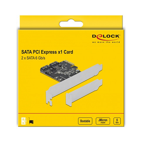 "DeLOCK 90431. Host interface: PCIe, Output interface: SATA. Country of origin: China. Chipset: JMicron JMB582, Data transfer rate (max): 6 Gbit/s. Windows operating systems supported: Windows 10 Education, Windows 10 Education x64, Windows 10 Enterprise, Windows 10 Enterprise x64,.... Package type: Box"\n"This PCI Express card by Delock expands the PC by two internal SATA ports. Different devices such as SSDs, hard drives, DVD-drives etc. can be connected to the card."