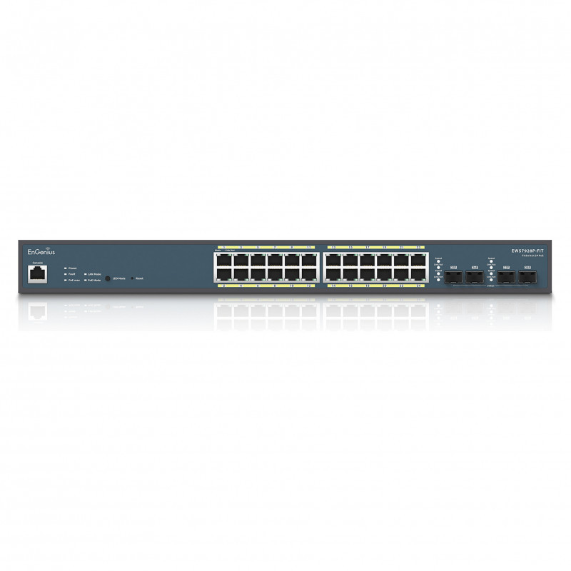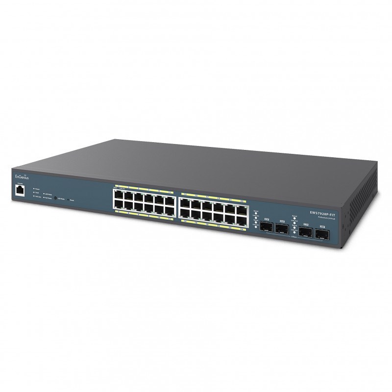 "EnGenius Switch 24-port GbE PoE.af/at(+) 210W 4xSFP L2 19i. Switch type: Managed, Switch layer: L2/L3. Basic switching RJ-45 Ethernet ports type: Gigabit Ethernet (10/100/1000), Basic switching RJ-45 Ethernet ports quantity: 24, Installed SFP modules quantity: 4. MAC address table: 8000 entries, Switching capacity: 56 Gbit/s. Networking standards: IEEE 802.3, IEEE 802.3ab, IEEE 802.3u, IEEE 802.3x. Power over Ethernet (PoE)"\n"EnGenius Fit 24-Port Gigabit 240W PoE+ Switch with 4 SFP Ports