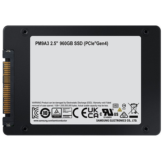 "Samsung PM9A3. SSD capacity: 960 GB, SSD form factor: 2.5"", Read speed: 6800 MB/s, Write speed: 2700 MB/s, Component for: PC"\n"High performance, highly reliable and secure NVMe U.2 SSD designed for servers that need enhanced data reliability to safeguard critical data.