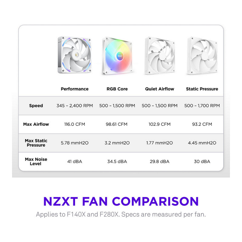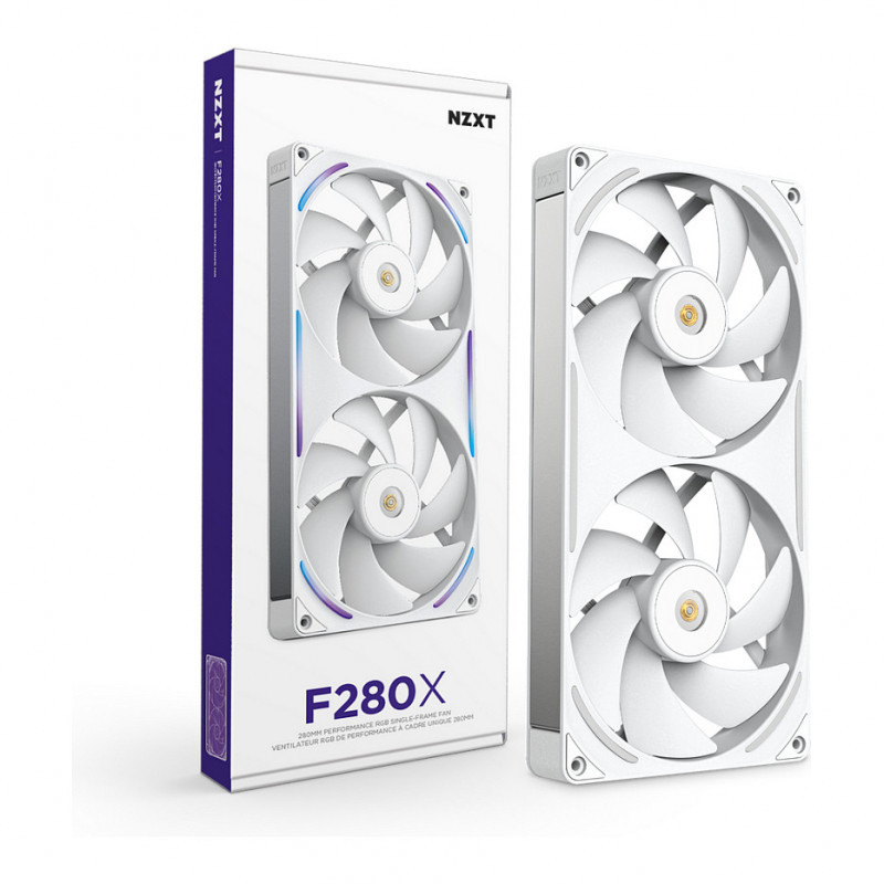 "NZXT F280X. Type: Fan, Fan diameter: 14 cm. Width: 280 mm, Depth: 30 mm, Height: 140 mm. Product colour: White"\n"The NZXT Performance Fans deliver powerful, quiet cooling with LCP construction, optimized blades, and a hybrid bearing system for superior airflow and durability. A reinforced core, advanced motor, and subtle RGB lighting combine performance and style for any gaming PC.