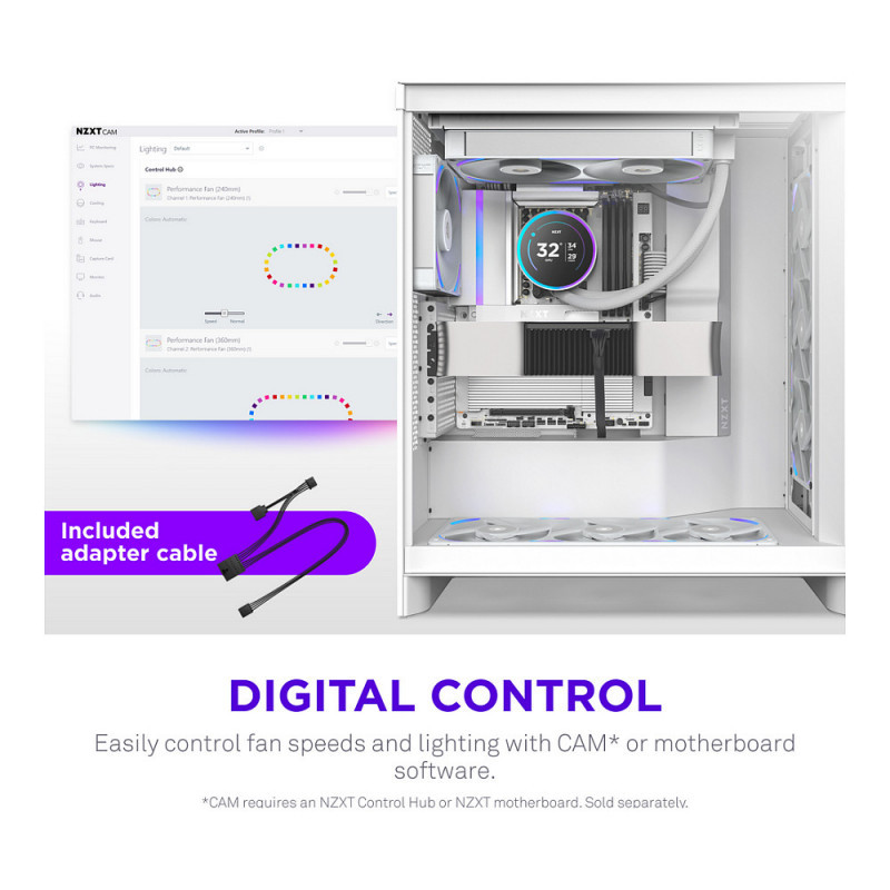 - Digital Control: Fine-tune fan speeds and RGB lighting effects through NZXT CAM* or motherboard software. *Requires NZXT Control Hub or NZXT motherboard required, sold separately.