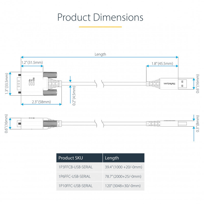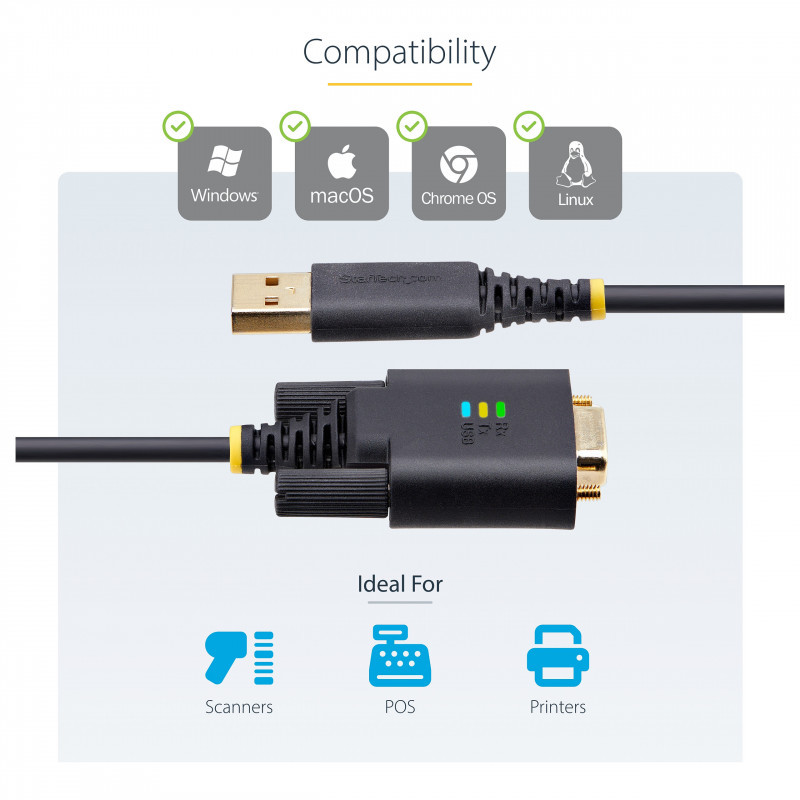 "StarTech.com 6.6ft (2m) USB to Serial Adapter Cable, COM Retention, Interchangeable Screws/Nuts, USB-A to DB9 RS232, FTDI IC, ESD Protection, Windows/macOS/Linux. Product colour: Black, Cable length: 2 m, Connector 1: USB Type-A. Quantity per pack: 1 pc(s), Package width: 220 mm, Package depth: 1 mm. Master (outer) case width: 600 mm, Master (outer) case length: 485 mm, Master (outer) case height: 345 mm"\n"Add an RS232 serial port to a laptop or desktop, using an available USB-A port