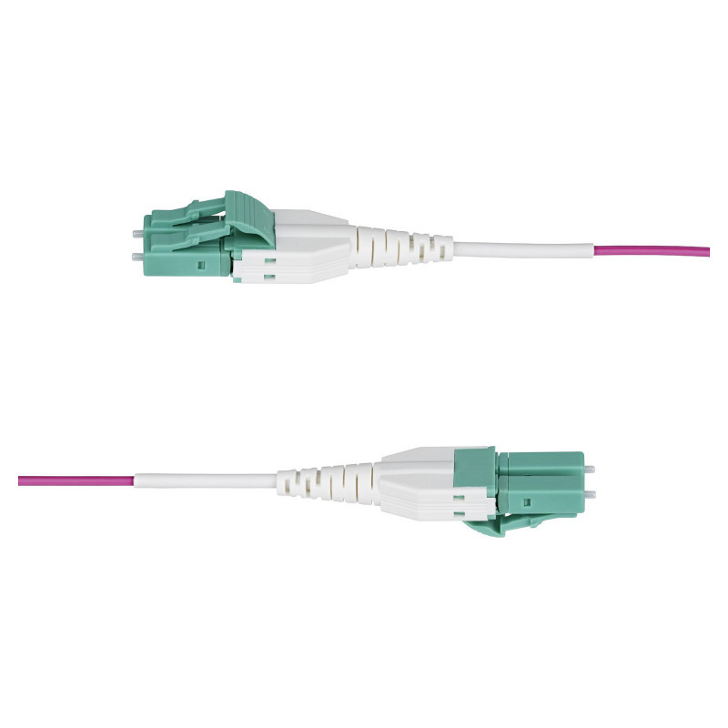 "StarTech.com 30m (100ft) LC to LC (UPC) OM4 Multimode Fiber Optic Cable, Erika Violet, 50/125µm, 40G/100G, LOMMF/VCSEL, Uniboot Fiber Jumper Cord, OFNR Riser Rated. Cable length: 30 m, Cable type: OFNR, Fibre optic type: OM4, Connector 1: LC, Connector 2: LC, Core diameter: 50 µm, Full duplex"\n"Install Erika Violet OM4 fiber cables for easy identification and streamlined cable management