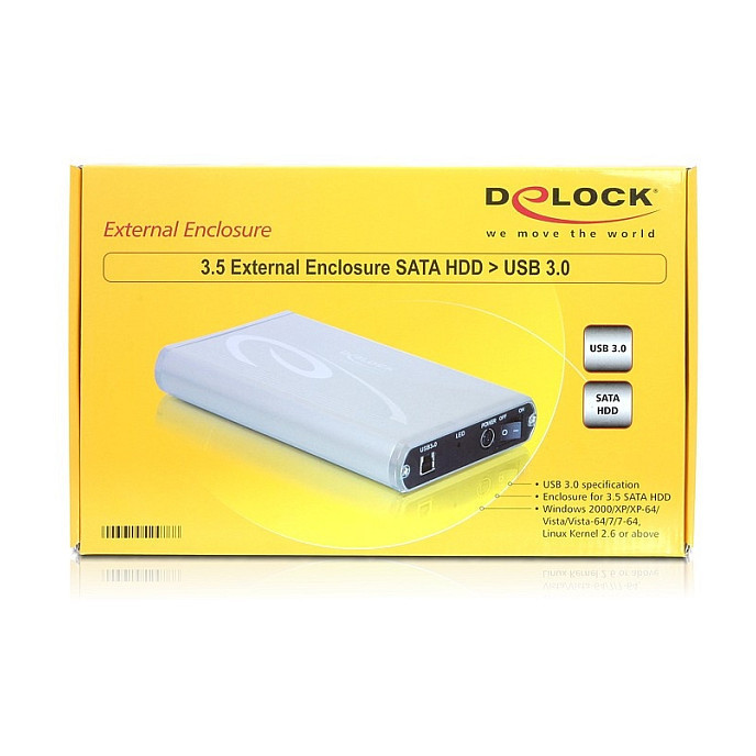 "DeLOCK 42478. Number of storage drives supported: 1, Storage drive size: 3.5"", Supported storage drive interfaces: Serial ATA. Product colour: Grey"\n"The aluminium enclosure supports any 3.5 SATA HDD. To be connected through USB 3.0 to any PC or Notebook.