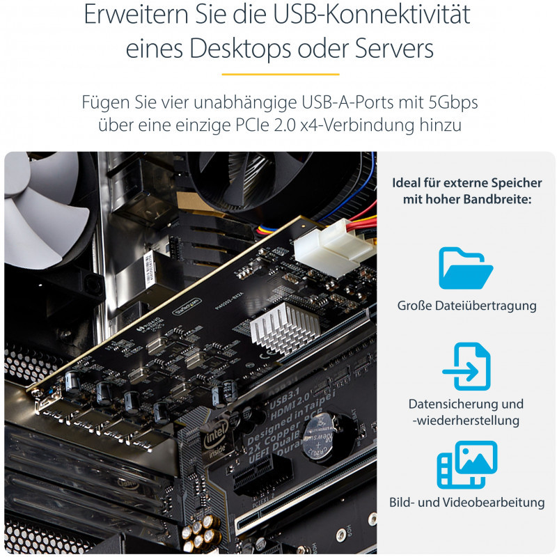 Upgrade or expand the USB connectivity of a desktop computer or server by adding four independent USB Type-A 5Gbps ports over a single PCI Express 2.0 x4 connection.