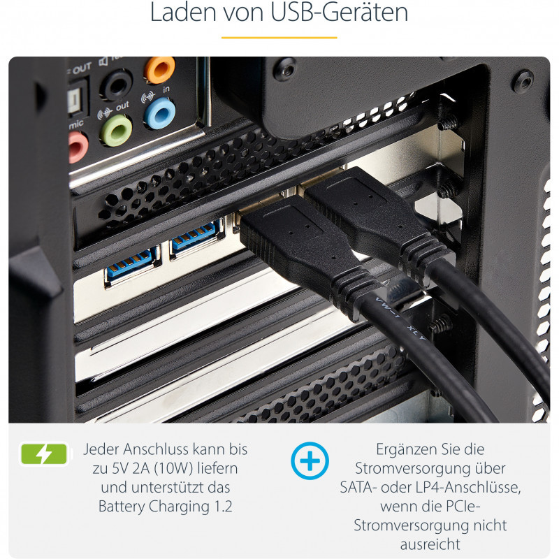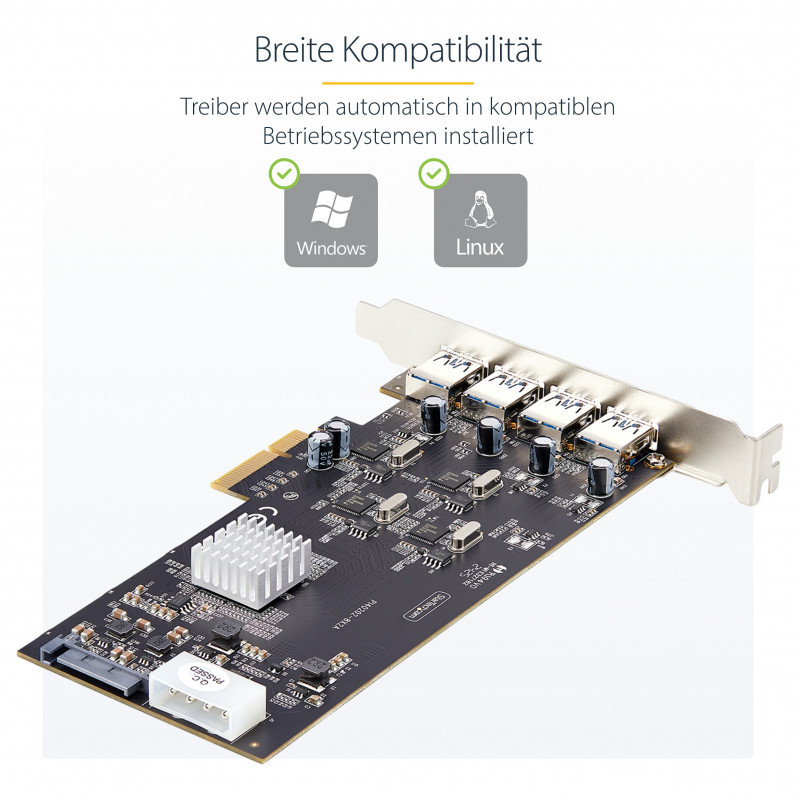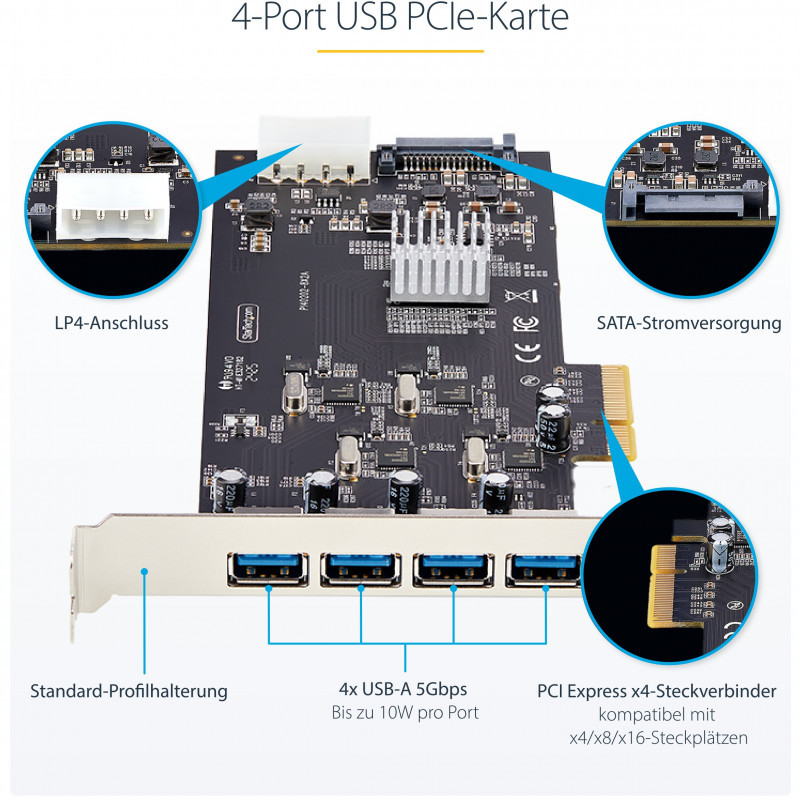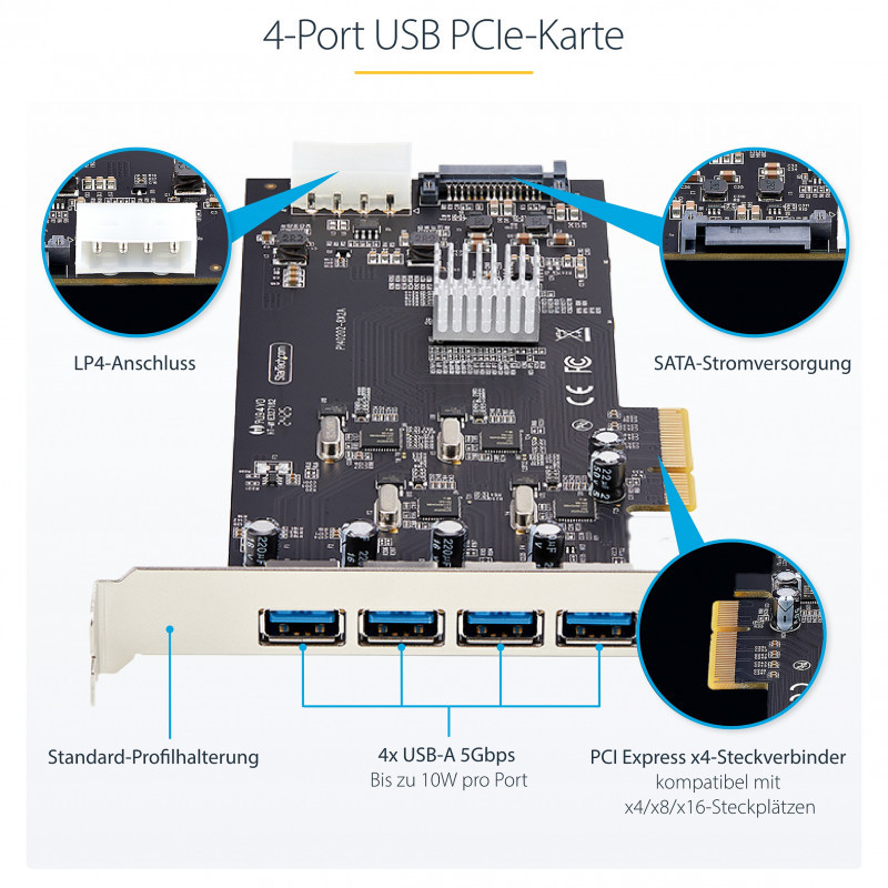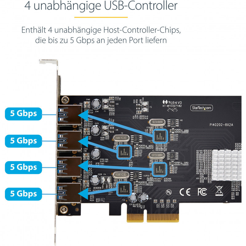 "StarTech.com 4-Port USB PCIe Card, USB 3.2 5Gbps, PCI Express Expansion Card with 4x Independent USB Controllers, 4x USB-A Ports, Windows/macOS/Linux. Host interface: PCIe, Output interface: USB 3.2 Gen 1 (3.1 Gen 1), Expansion card form factor: Full-height / Low-profile. Product colour: Black. Chipset: Renesas - UPD720202 x4, Diodes Incorporated - PI7C9X2G608, Data transfer rate (max): 5 Gbit/s. Windows operating systems supported: Windows 10, Windows 10 Education, Windows 10 Education x64, Windows 10 Enterprise, Windows 10..., Server operating systems supported: Windows Server 2008 R2, Windows Server 2012 R2, Windows Server 2016, Windows Server 2019. Width: 120 mm, Depth: 169 mm, Height: 19 mm"\n"Add four 5Gbps USB Type-A ports through via PCI Express