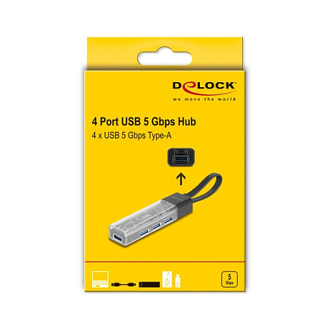"DeLOCK 64335. Host interface: USB 3.2 Gen 1 (3.1 Gen 1) Type-A + Type-C, Hub interfaces: USB 3.2 Gen 1 (3.1 Gen 1) Type-A. Data transfer rate: 5000 Mbit/s, Product colour: Black, Transparent, Housing material: Plastic. Power supply type: USB. Windows operating systems supported: Windows 10, Windows 10 x64, Windows 11, Mac operating systems supported: Mac OS 12.4, Mac OS 13.1, Mac OS 14.5, Mac OS X 13.0 Ventura, Mac OS X 14.0 Sonoma, Mac OS X 15.0..., Linux operating systems supported: Linux Kernel 6.2, Linux Kernel 6.5. Width: 27 mm, Depth: 104 mm, Height: 17 mm"\n"This solid USB hub by Delock can be connected to a computer, laptop or mobile device via the USB Type-A or USB-C™ interface. It expands the computer by 4 USB Type-A ports. Different USB devices such as USB flash memory, card reader, external enclosure etc. can be connected.