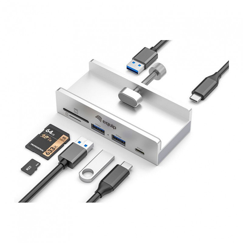 "Equip 128968. Host interface: USB 3.2 Gen 1 (3.1 Gen 1) Type-A, Hub interfaces: USB 3.2 Gen 1 (3.1 Gen 1) Type-A, USB 3.2 Gen 1 (3.1 Gen 1) Type-C, Compatible memory cards: MicroSD (TransFlash), SD. Data transfer rate: 5000 Mbit/s, Product colour: Aluminium, Housing material: Aluminium. Power supply type: USB, Input voltage: 5 V, Input current: 2 A. Width: 45.8 mm, Depth: 25.4 mm, Height: 97 mm. Quantity per pack: 1 pc(s)"\n