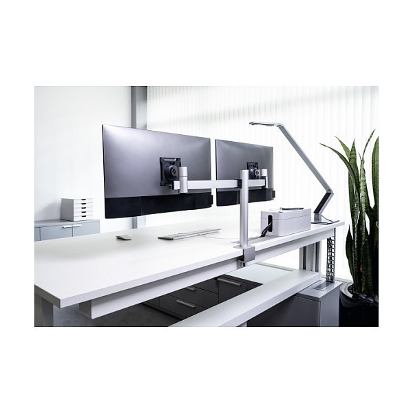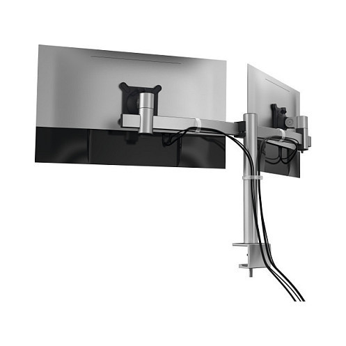 "Durable Monitor mount for 2 screens. Mounting: Clamp, Maximum weight capacity: 8 kg, Minimum screen size: 53.3 cm (21""), Maximum screen size: 68.6 cm (27""), Minimum VESA mount: 75 x 75 mm, Maximum VESA mount: 100 x 100 mm. Height adjustment, Tilt angle range: 0 - 110°. Product colour: Silver"\n"Whether at work or at home, most people spend a lot of time in front of the computer screen. Health and wellbeing, therefore, play an important role at the desk. The dual monitor mount from DURABLE supports particularly efficient work at the ergonomic workplace.