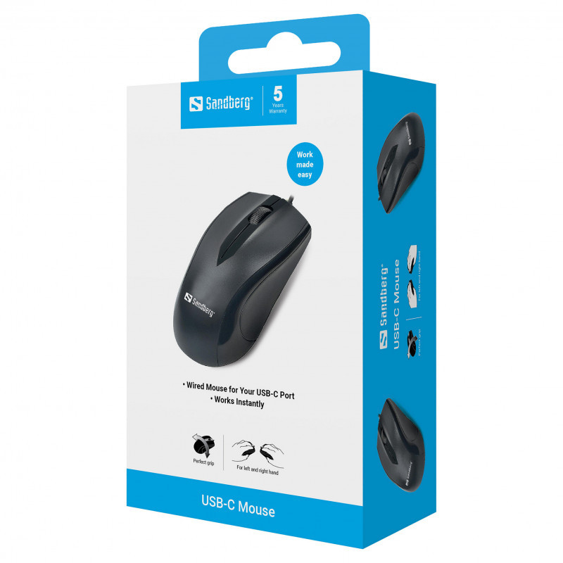 "Sandberg USB-C Mouse. Form factor: Ambidextrous. Movement detection technology: Optical, Device interface: USB Type-C, Movement resolution: 1200 DPI, Buttons type: Pressed buttons, Buttons quantity: 3, Scroll type: Wheel. Power source: Cable. Product colour: Black"\n"The Sandberg USB-C Mouse is a very good standard mouse for home and office use. The mouse cable has a USB-C plug, so there is no need for an adapter when connecting it to a device with a USB-C port. Works instantly without software installation."