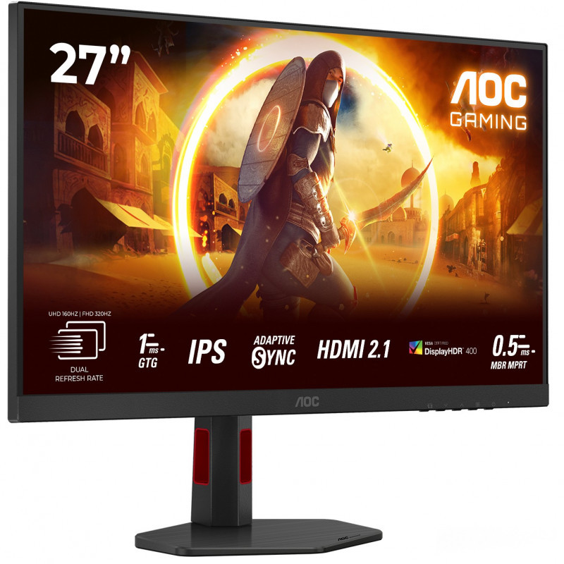 "AOC G4 U27G4R. Display diagonal: 68.6 cm (27""), Display resolution: 3840 x 2160 pixels, HD type: 4K Ultra HD, Display technology: LED, Response time: 1 ms, Native aspect ratio: 16:9, Viewing angle, horizontal: 178°, Viewing angle, vertical: 178°. Built-in USB hub, USB hub version: 3.2 Gen 1 (3.1 Gen 1). VESA mounting, Height adjustment. Product colour: Black, Red"\n"Dominate your gaming experience with the U27G4R Dual-Frame Monitor, a cutting-edge display offering ultimate flexibility between UHD at 160Hz and FHD at 320Hz.