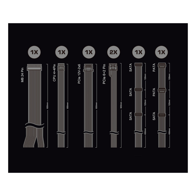 "Asrock PRO-750G. Total power: 750 W, AC input voltage: 100 - 240 V, AC input frequency: 50/60 Hz. Motherboard power connector: 24-pin ATX, Motherboard power cable length: 60 cm, SATA power cable length: 450,570,690 mm. Purpose: PC, Power supply unit (PSU) form factor: ATX, 80 PLUS certification: 80 PLUS Gold. Product colour: Black, Cooling type: Active, Fan diameter: 12 cm. Width: 150 mm, Depth: 140 mm, Height: 86 mm"\n"Native PCIe 12V-2x6 Cable