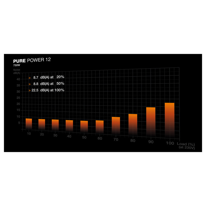 "be quiet! PURE POWER 12 750W. Total power: 750 W, AC input voltage: 100 - 240 V, Peak power: 820 W. Motherboard power connector: 20+4 pin ATX, Motherboard power cable length: 55 cm, SATA power cable length: 500,650,800,950 mm. Purpose: PC, Power supply unit (PSU) form factor: ATX, 80 PLUS certification: 80 PLUS Gold. Product colour: Black, Cooling type: Active, Fan diameter: 12 cm. Cables included: AC"\n"Exceptional quiet, superior features