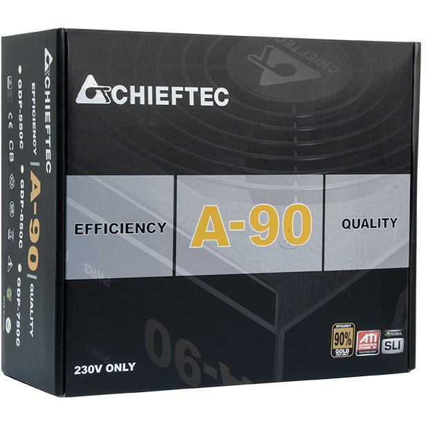 "Chieftec GDP-750C. Total power: 750 W, AC input voltage: 200 - 240 V, AC input frequency: 47 - 63 Hz. Motherboard power connector: 20+4 pin ATX, Cabling type: Semi-Modular. Purpose: PC, Power supply unit (PSU) form factor: PS/2. Product colour: Black, Fan diameter: 14 cm, Number of fans: 1 fan(s). Width: 160 mm, Depth: 150 mm, Height: 87 mm"\n"Efficiency at low cost, that’s the reason, why the new A-90 series from CHIEFTEC has been invented. The three high performance PSU’s cover with their nominal power output of 550 watts – 750 watts all kinds of usage possibilities. With a fixed output voltage of 230 V, this power supply series is especially made for cost-aware computer consumers. The PSU’s have an efficiency of >90% and thus meet the 80plus gold requirements."