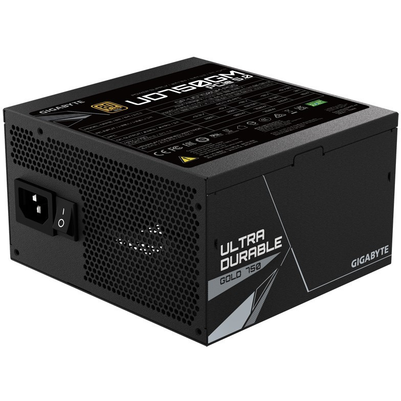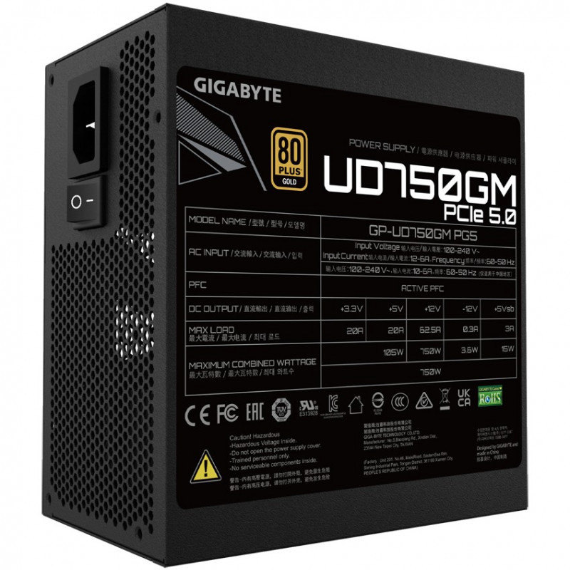 "GIGABYTE UD750GM PG5. Total power: 750 W, AC input voltage: 100 - 240 V, Input current: 12 A. Motherboard power connector: 20+4 pin ATX, Motherboard power cable length: 61 cm, SATA power cable length: 150,300,450,600 mm. Purpose: PC, Power supply unit (PSU) form factor: ATX, 80 PLUS certification: 80 PLUS Gold. Product colour: Black, Cooling type: Active, Fan diameter: 12 cm. Cables included: CPU, PCIe, Peripheral (Molex), SATA"\n"Support PCIe Gen 5.0 graphics cards