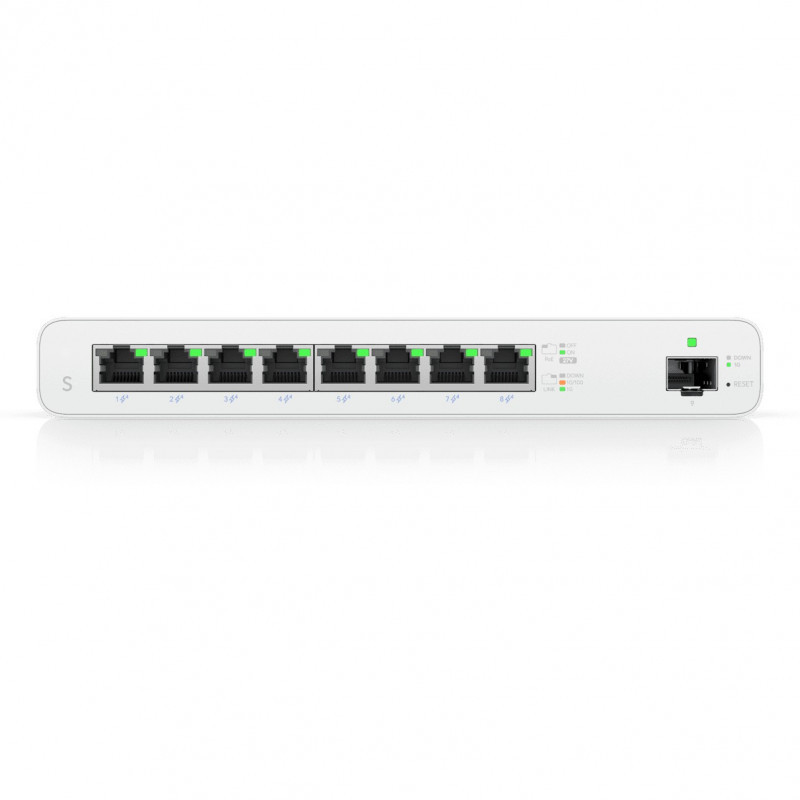 "Ubiquiti UISP. Switch type: Managed, Switch layer: L2. Basic switching RJ-45 Ethernet ports type: Gigabit Ethernet (10/100/1000), Basic switching RJ-45 Ethernet ports quantity: 8. DC input voltage: 20 - 28 V. Power connector: DC-in jack. Power over Ethernet (PoE)"\n"Gigabit PoE switch for MicroPoP applications.