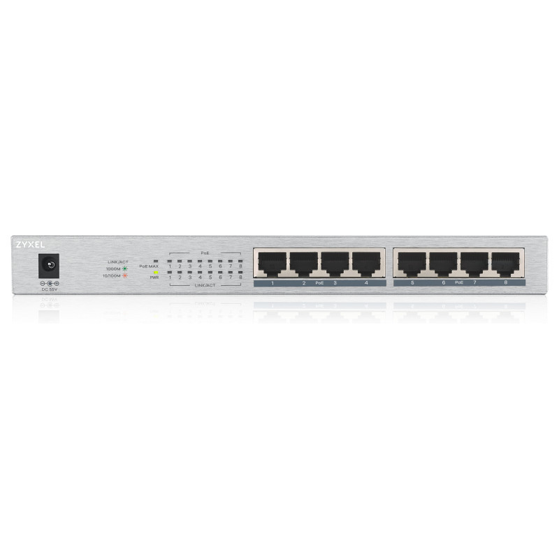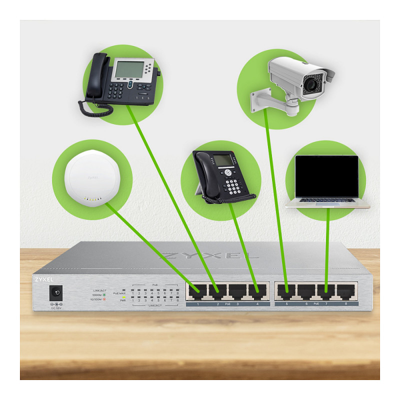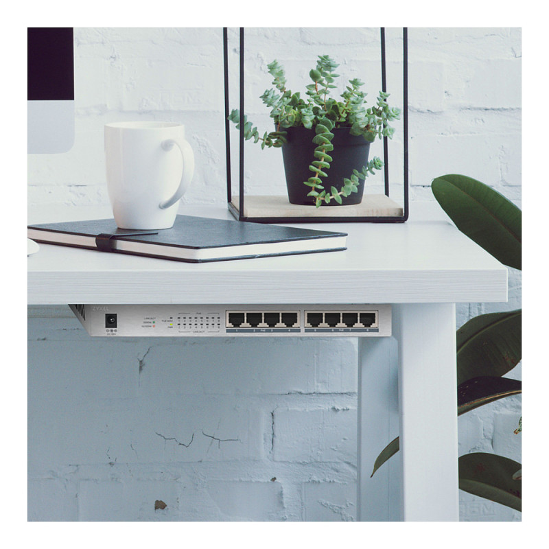 The Zyxel GS1008HP is equipped with 8 gigabit Ethernet ports, all of which are PoE ports that can deliver up to 60W of total PoE budget. The GS1008HP can easily connect with PoE ready devices to your network with plug-and-play design while providing power-saving benefits without compromising performance. The GS1008HP fills a long-standing hole in the market for unmanaged PoE switches that feature the 802.3at standard, has a high power budget and are affordable for SOHOs and small businesses.