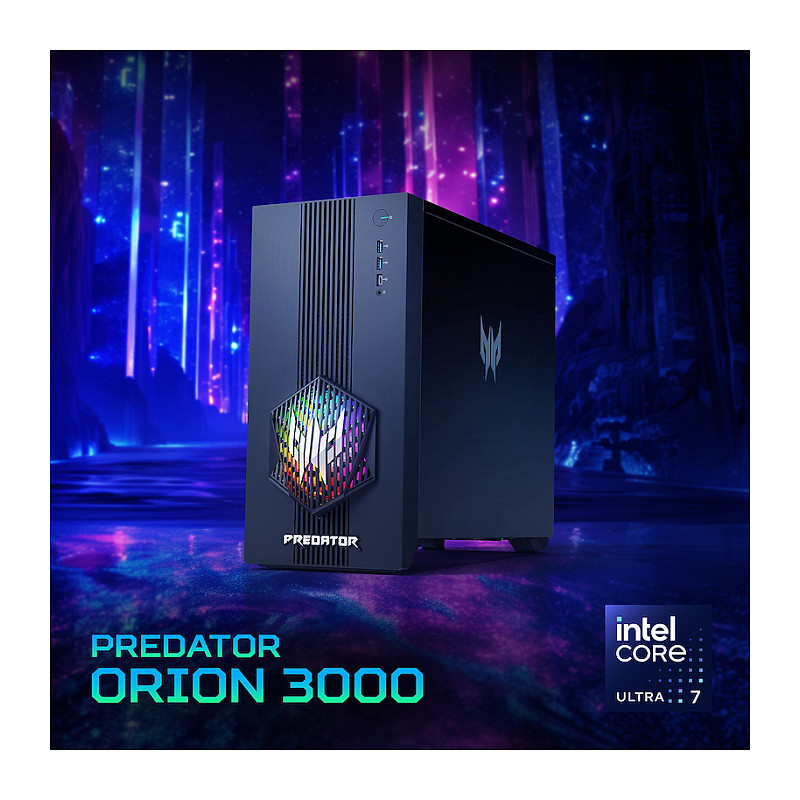 "Acer Predator PO3-665_H810. Processor family: Intel Core Ultra 7, Processor model: 265F. Internal memory: 32 GB, Internal memory type: DDR4-SDRAM. Total storage capacity: 1 TB, Storage media: SSD. Discrete graphics card model: NVIDIA GeForce RTX 5060. Wi-Fi. Operating system installed: Windows 11 Home, Operating system architecture: 64-bit. Power supply: 850 W. Chassis type: Desktop. Product type: PC. Product colour: Black"\n"In a world where space is scarce and power is everything, the 28L Predator Orion 3000 fuses raw force and AI precision in a compact form. With up to an Intel® Core™ Ultra 7 processor 265F and NVIDIA® GeForce RTX™ 5070 graphics, it’s built to command.