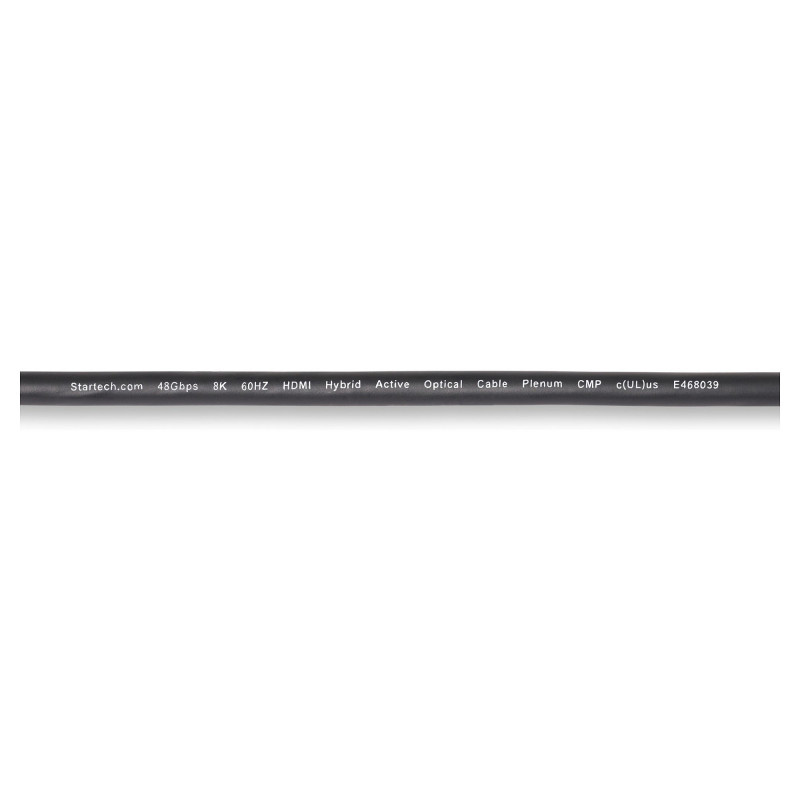 "StarTech.com 100ft (30.4m) HDMI 2.1 Hybrid Active Optical Cable (AOC), CMP, Plenum Rated, 8K Ultra High Speed HDMI 2.1/2.0 Fiber Optic Cable, 48Gbps, 8K 60Hz/4K 120Hz, HDR10+/FRL/TMDS/eARC. Cable length: 30.4 m, Connector 1: HDMI Type A (Standard), Connector 1 gender: Male, Connector 2: HDMI Type A (Standard), Connector 2 gender: Male, Connector contacts plating: Gold, Data transfer rate: 48 Gbit/s, Audio Return Channel (ARC), Product colour: Black, Silver"\n"Reliably connect high-bandwidth HDMI 2.1 devices through plenum spaces