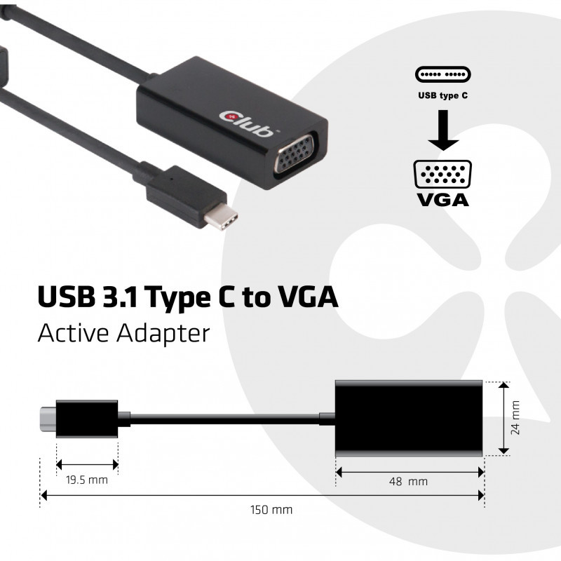 "CLUB3D USB 3.1 Type C to VGA Active Adapter. Connector 1: USB C, Connector 2: VGA, Cable length: 0.15 m, Connector contacts plating: Gold. Product colour: Black"\n"The Club 3D CAC-1502 is an Active VGA signal converter. This USB-C to VGA Active Adapter is the easiest solution for connecting your USB Type C source device featuring DisplayPort™ Alternate Mode to a VGA enabled Monitor or Projector. The VGA adapter is compact and highly portable. Powered by the USB-C port, the adapter requires no external power and is also ideal for use with notebooks and Ultrabooks.