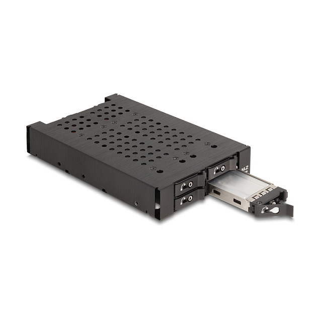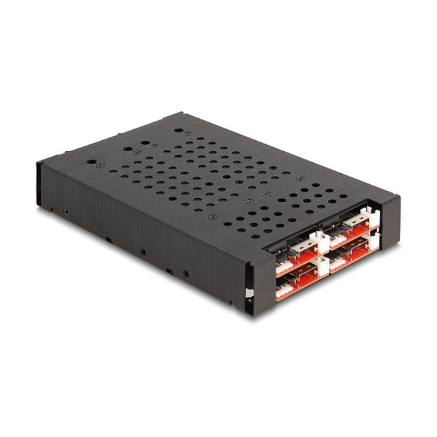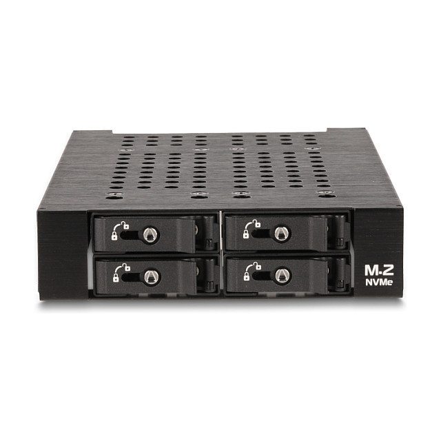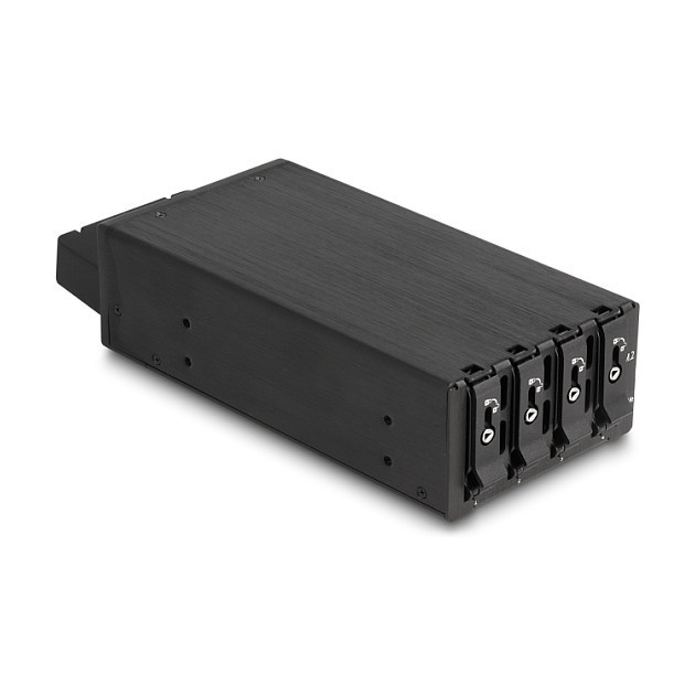 "DeLOCK 3.5″ Mobile Rack for 4 x M.2 NVMe SSD with Slim SAS SFF-8654 connector. Size (imperial): 8.89 cm (3.5""), Type: Storage drive tray, Product colour: Black. Width: 100 mm, Depth: 159 mm, Height: 25 mm. Quantity per pack: 1 pc(s), Number of lock keys included: 2 pc(s). Windows operating systems supported: Windows 10, Windows 10 x64, Windows 11, Linux operating systems supported: Linux Kernel 6.2"\n"Description