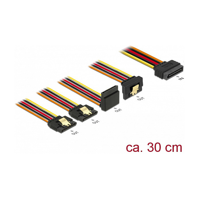 "DeLOCK 60148. Cable length: 0.3 m, Connector 1: SATA 15-pin, Connector 2: 4 x SATA 15-pin. Package type: Polybag"\n"This cable by Delock can supply power for four SATA devices via one free SATA 15 pin power connector of the power supply. The metal clips on the receptacles and the clearance on the plug ensure that the cable reliably clicks into place."