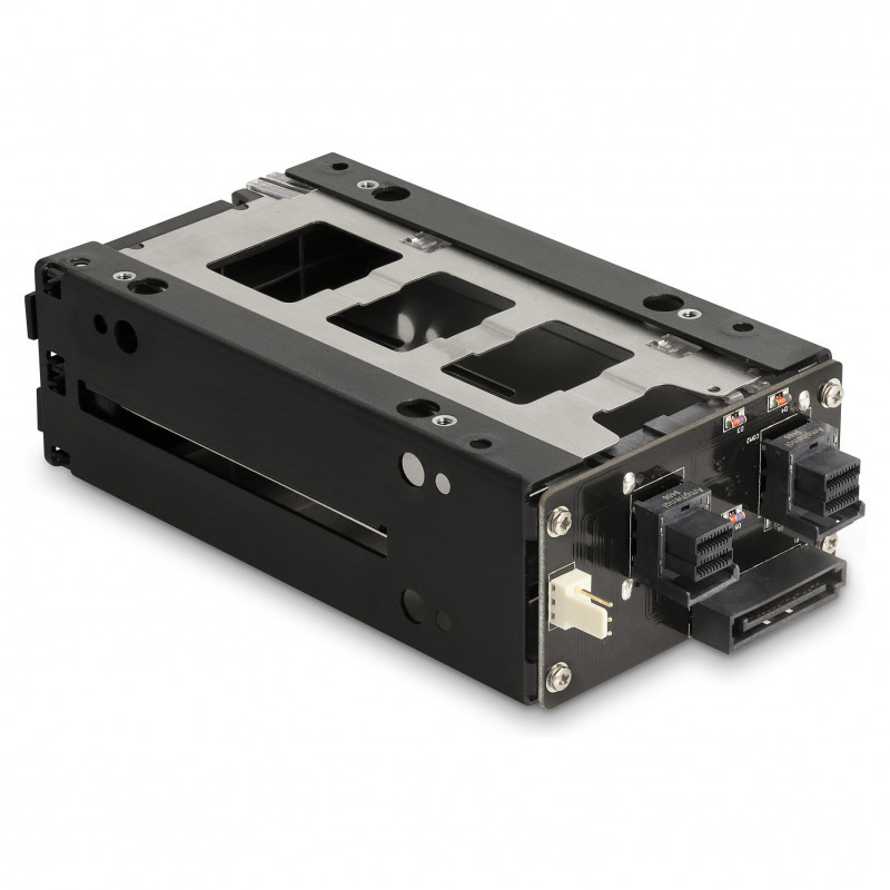 "DeLOCK Slim Bay Mobile Rack for 2 x 2.5″ U.2 NVMe SSD with 5.25″ frame. Size (imperial): 2x 2.5"", Type: Storage drive tray, Product colour: Black. Width: 140 mm, Depth: 145 mm, Height: 42 mm. Quantity per pack: 1 pc(s), Number of lock keys included: 2 pc(s). Windows operating systems supported: Windows 10, Windows 11, Windows 8.1, Linux operating systems supported: Linux Kernel 5.8, Linux Kernel 5.9. Country of origin: China"\n"This solid metal mobile rack by Delock can be installed into a free 5.25″ bay of a PC by the help of the included frame. Furthermore, it is also possible to use the mobile rack directly in a server rack or 19″ storage enclosure.
