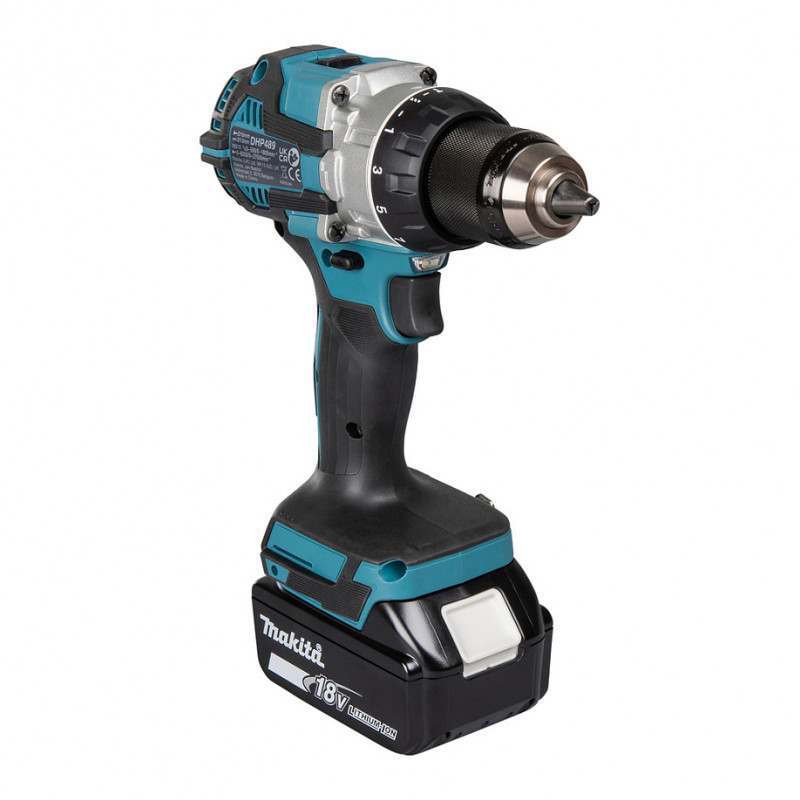 "Makita DHP489RTJ. Product type: Power screwdriver, Handle shape: Pistol handle, Chuck diameter: 1/2"". Idle speed (max): 1800 RPM, Idle speed (min): 550 RPM, Drilling diameter in steel (max): 1.3 cm. Power source: Battery, Battery voltage: 18 V, Battery technology: Lithium-Ion (Li-Ion). Width: 81 mm, Depth: 175 mm, Height: 261 mm"\n
