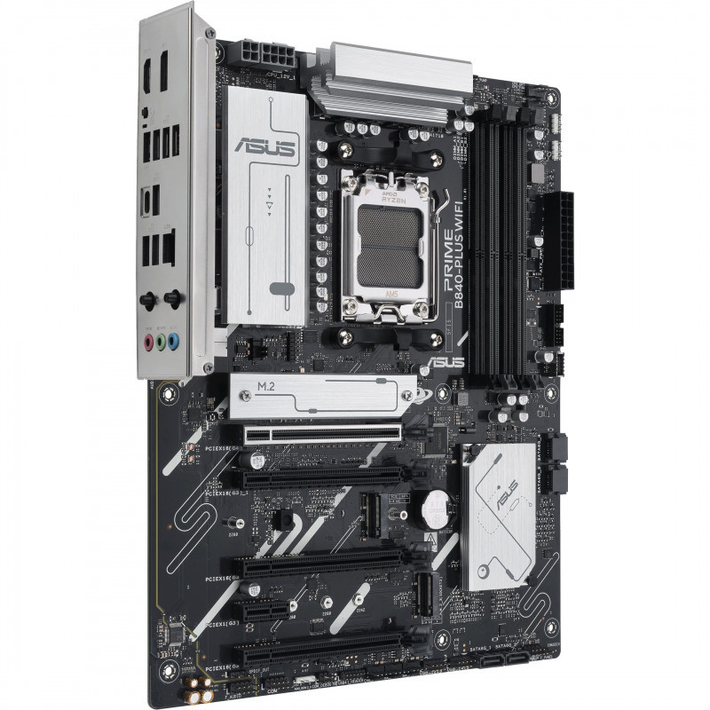 "ASUS PRIME B840-PLUS WIFI. Processor manufacturer: AMD, Processor socket: Socket AM5, Compatible processor series: AMD Ryzen 7000 Series, AMD Ryzen 8000 Series, AMD Ryzen 9000 Series. Supported memory types: DDR5-SDRAM, Maximum internal memory: 192 GB, Memory slots type: DIMM. Supported storage drive interfaces: M.2, SATA III, Supported storage drive types: HDD & SSD, RAID levels: 0, 1, 5, 10. Ethernet interface type: 2.5 Gigabit Ethernet, Top Wi-Fi standard: Wi-Fi 6E (802.11ax), Wi-Fi standards: Wi-Fi 6E (802.11ax). Component for: PC, Motherboard form factor: ATX, Motherboard chipset family: AMD"\n"B840-PLUS WIFI
