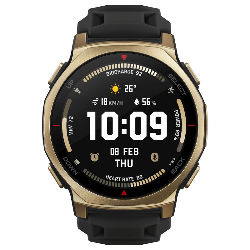 "Amazfit T-rex 3 Pro. Display diagonal: 3.35 cm (1.32""), Display technology: AMOLED, Display resolution: 466 x 466 pixels, Touchscreen. RAM capacity: 64 MB, Flash memory: 16 GB. Wi-Fi. GPS (satellite). Battery capacity: 640 mAh. Weight: 46.8 g. Waterproof up to: 45 m, Band material: Silicone, Band colour: Black"\n