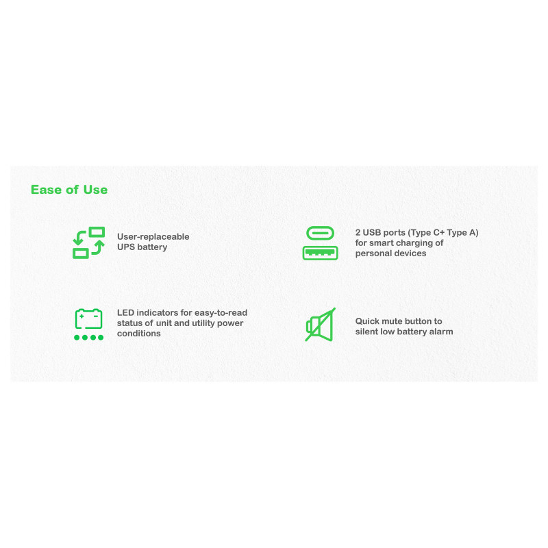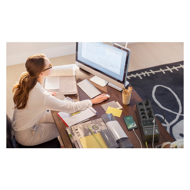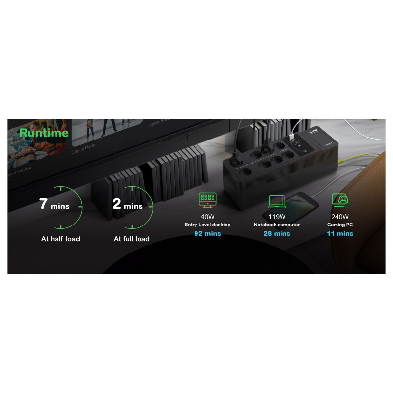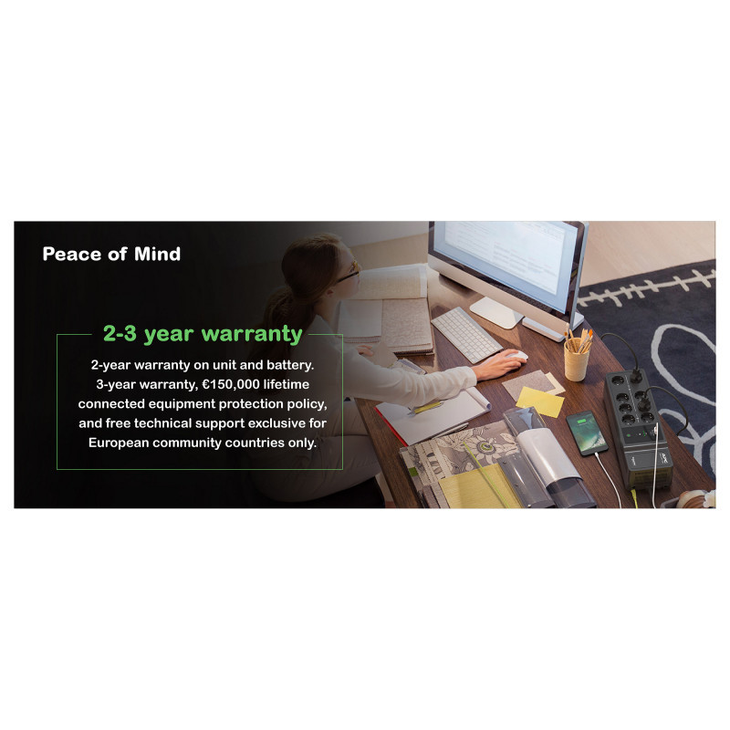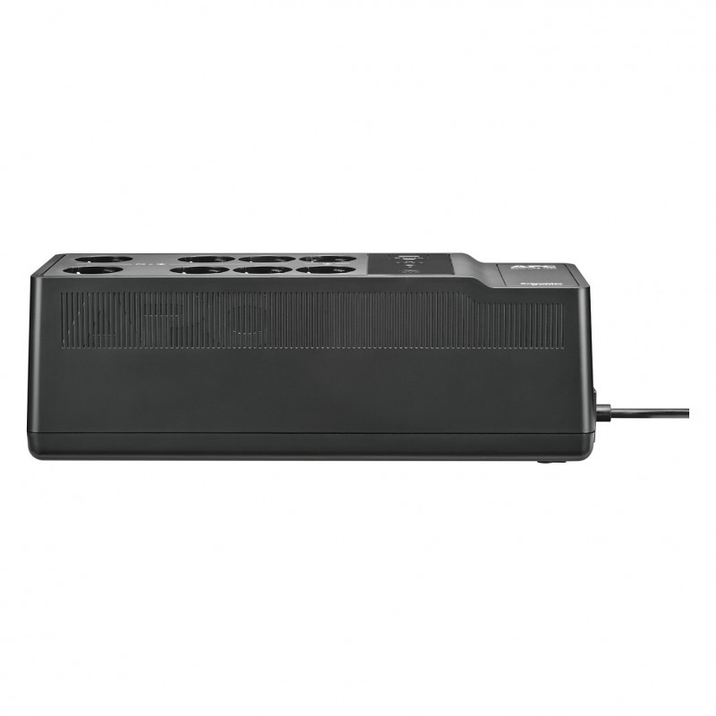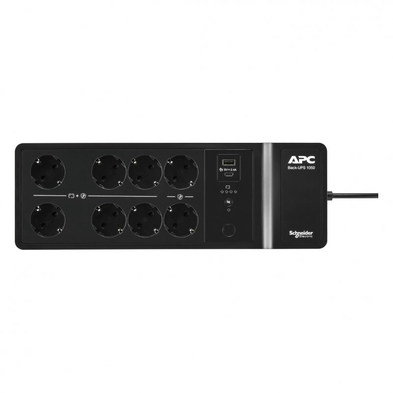 "APC Back-UPS, 1050VA/600W Floor/Wall Mount, 230V, 8x Schuko CEE 7/3 outlets, USB Type A+C Port, User Replaceable Battery. UPS topology: Standby (Offline), Output power capacity: 1.05 kVA, Output power: 600 W. AC outlet types: CEE. Battery technology: Lead-Acid, Battery capacity: 9 Ah, Battery voltage: 12 V. Form factor: Desktop, Product colour: Black. Compliance certificates: CE, EAC"\n"This APC Back-UPS offers power and surge protection for wireless networks, computers, gaming consoles and other electronics in your home or business. The 1050VA floor/wall mount UPS has 8 total outlets, 6 of which are battery back up and surge protection, and 2 that are surge protection only. It has a surge energy rating of 310 Joules. It has 2 USB Ports (Type A + C) for smart charging of personal devices. This UPS has a 2-year warranty on unit and battery. 3-year warranty, €100,000 lifetime connected equipment protection policy, and free technical support exclusive for European community countries only. It is compatible with a dedicated user-replaceable battery, and the APC replacement battery cartridge helps restore UPS performance to the original specifications."